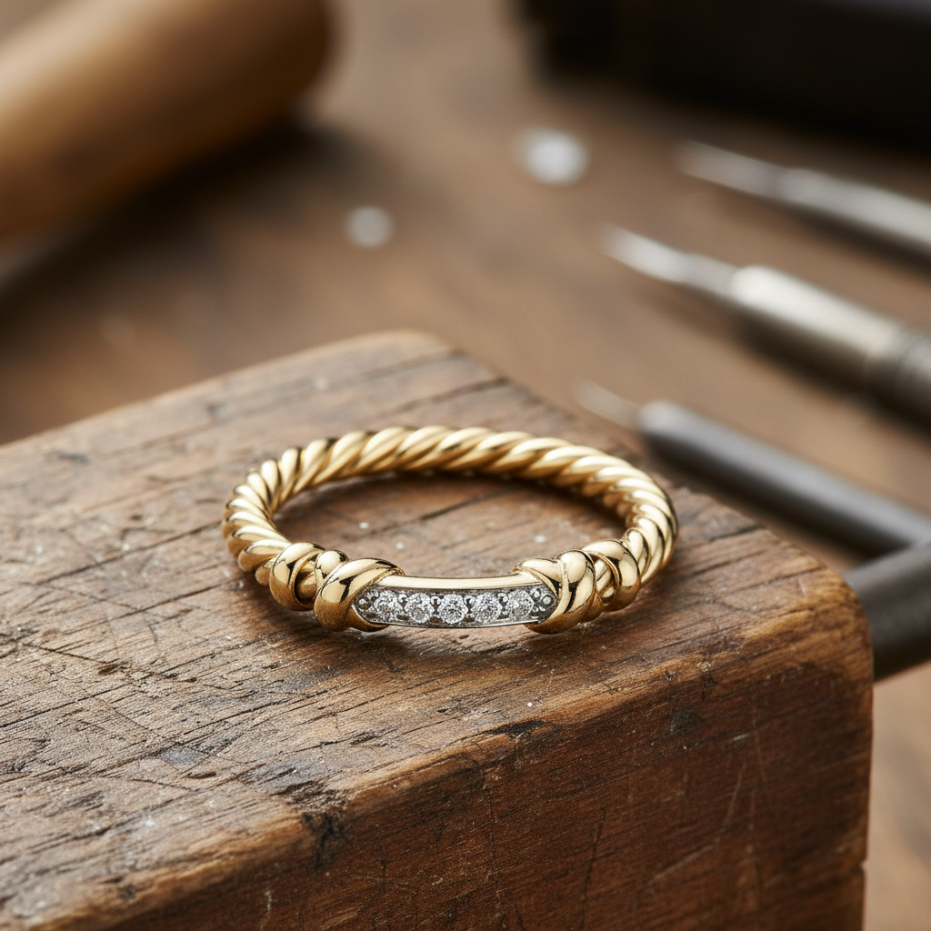 A fine row of round-cut lab grown diamonds totaling 0.08 carats introduces a soft ribbon of light across the band. Each colorless VVS-clarity stone is precision-set to deliver exceptional brilliance while preserving the delicate silhouette of the design. The polished rope texture adds dimension and artistry, creating a piece that feels both timeless and contemporary.