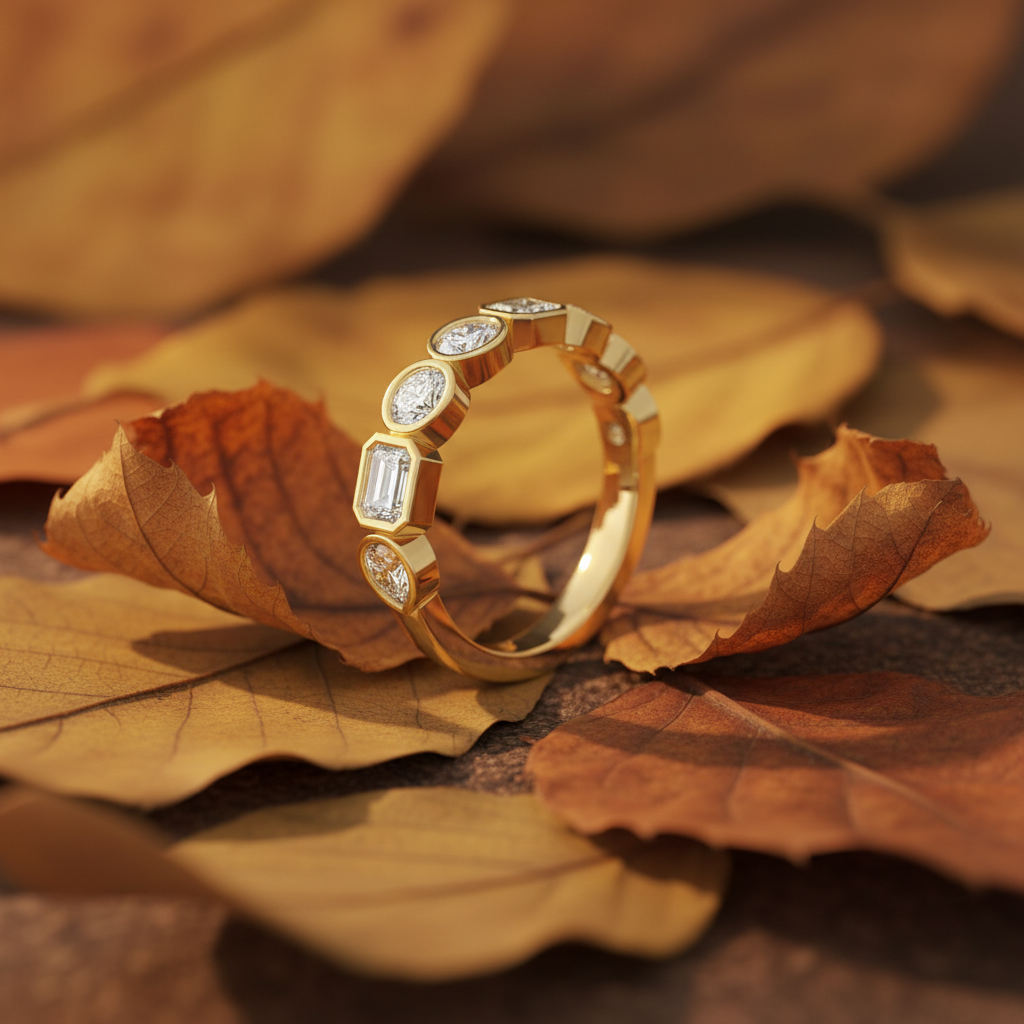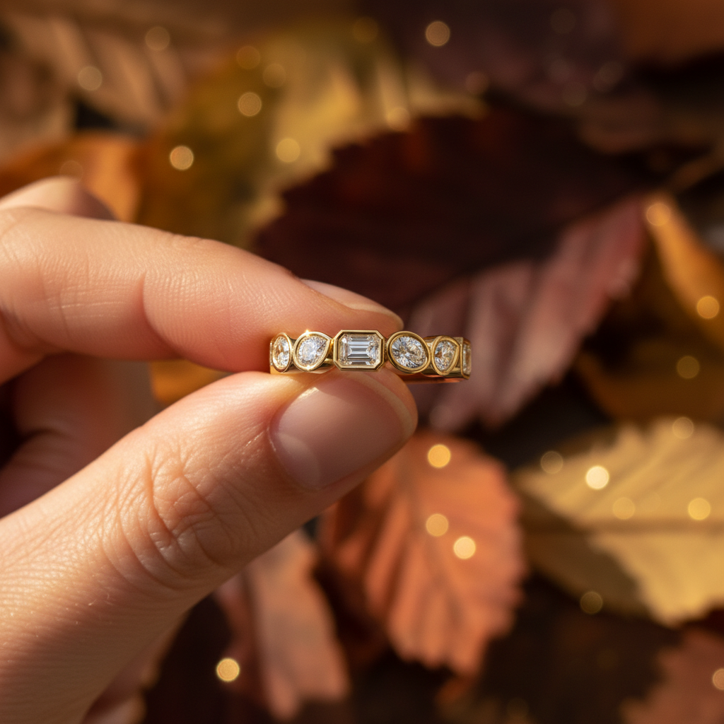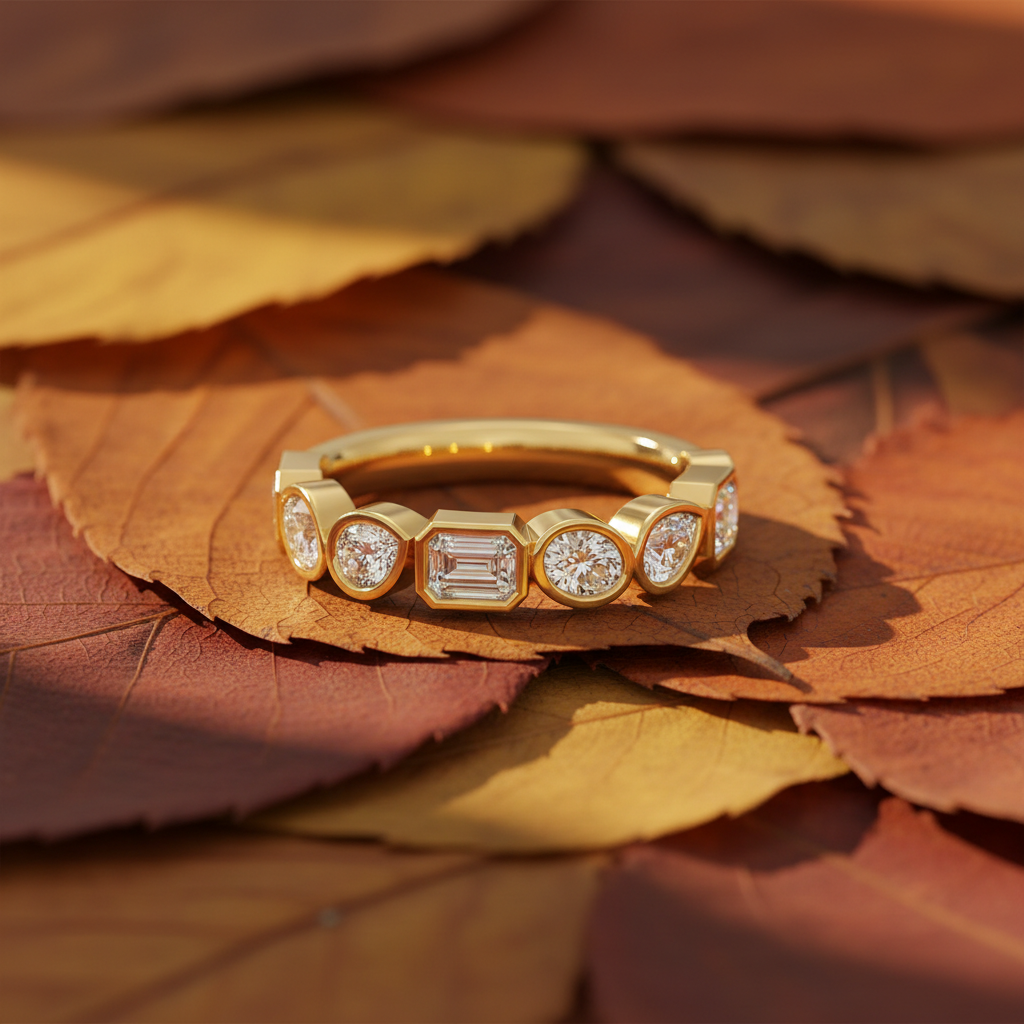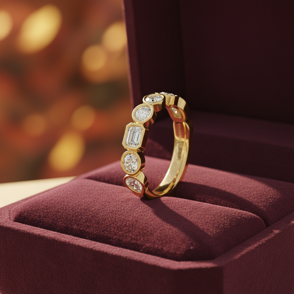 Elevated yet effortlessly wearable, the Solara Multi Cut Lab Grown Diamond Half Eternity Ring embodies contemporary luxury with conscious craftsmanship. Designed for the modern woman, this refined band features a curated arrangement of pear, emerald, oval, and complementary cuts creating a rhythmic play of light across the finger.