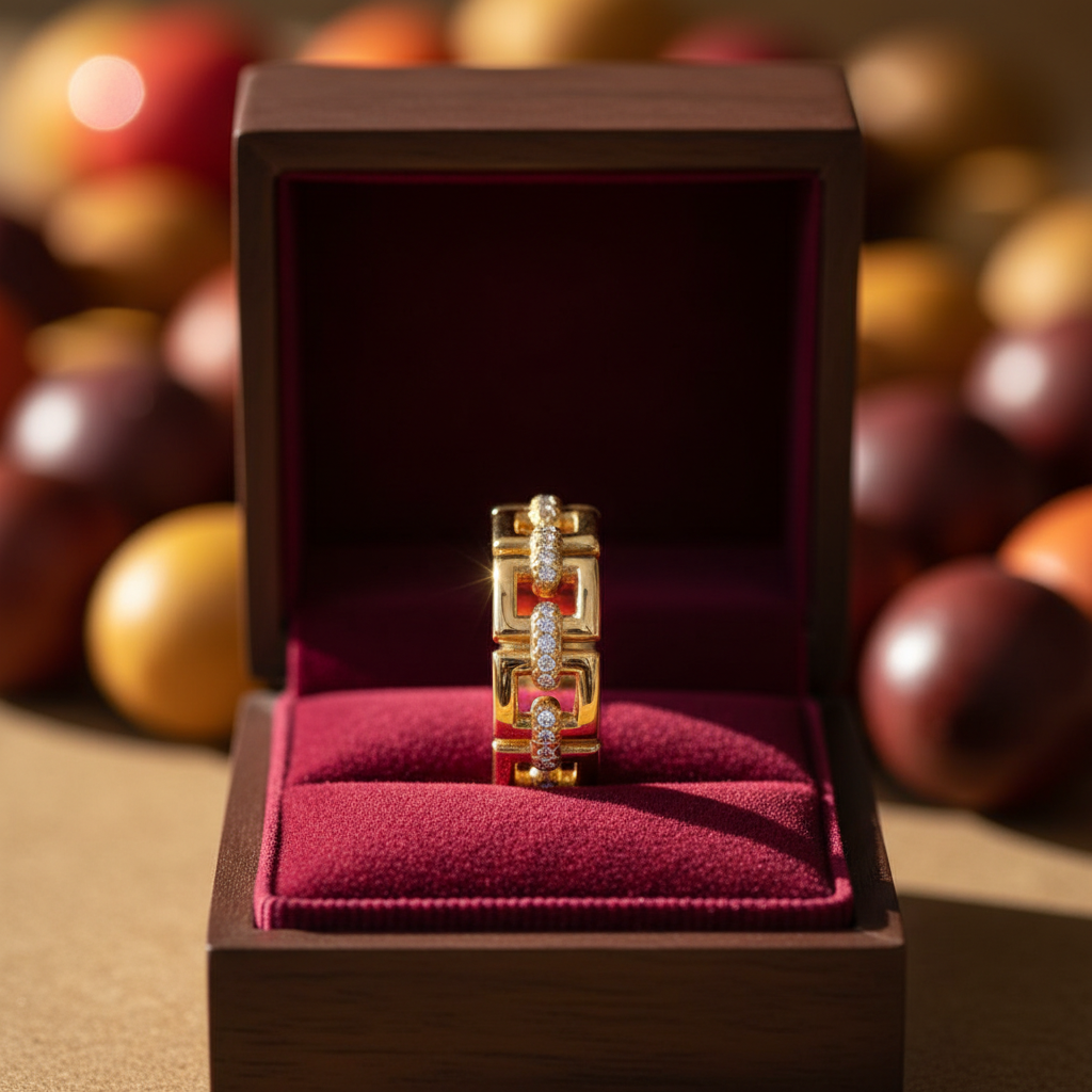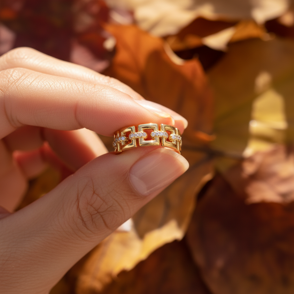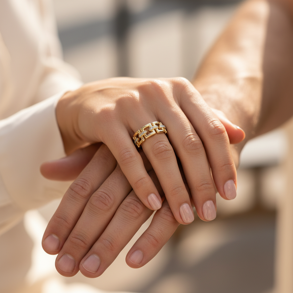 Designed for the modern American woman who embraces bold design and meaningful beauty, this statement band elevates both everyday wear and occasion styling. Worn alone or layered with minimalist bands, it expresses refined strength with radiant sophistication.