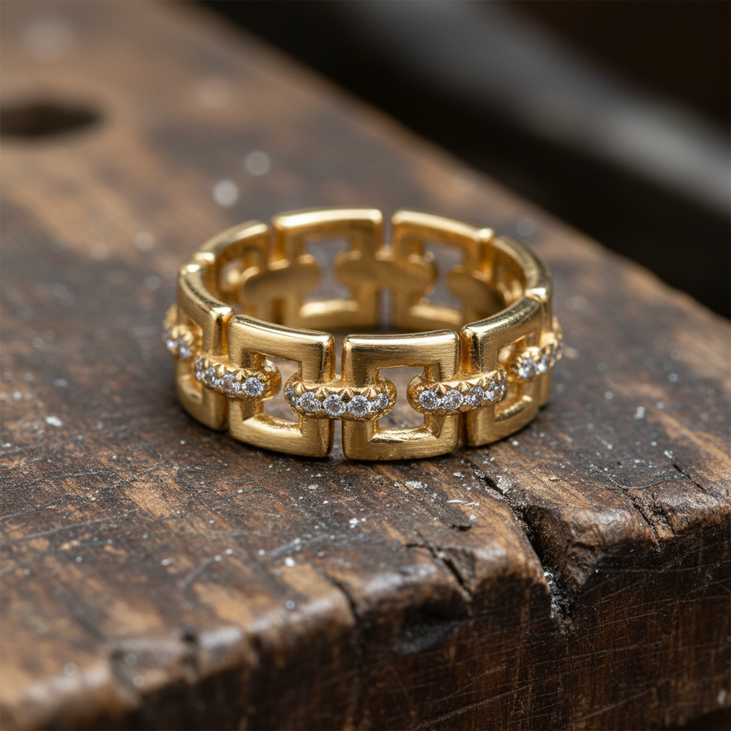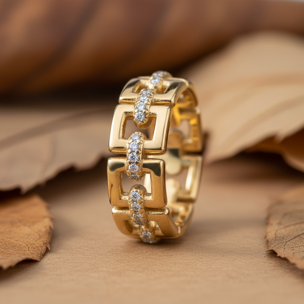 Confident, sculptural, and unmistakably modern, the Modern Link Moissanite Diamond Statement Band embodies architectural elegance with luminous brilliance. Crafted in a striking interlocking link motif, this design symbolizes strength, connection, and empowered individuality a distinctive statement for contemporary style.