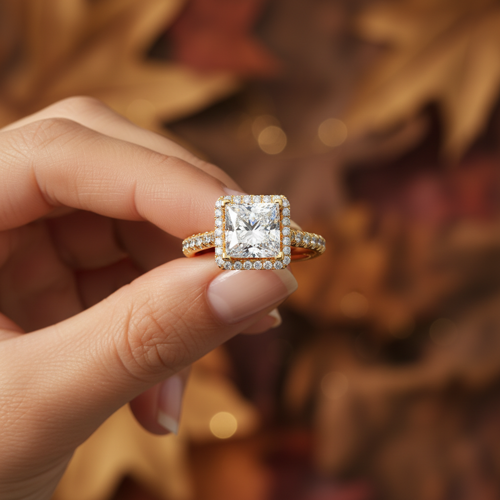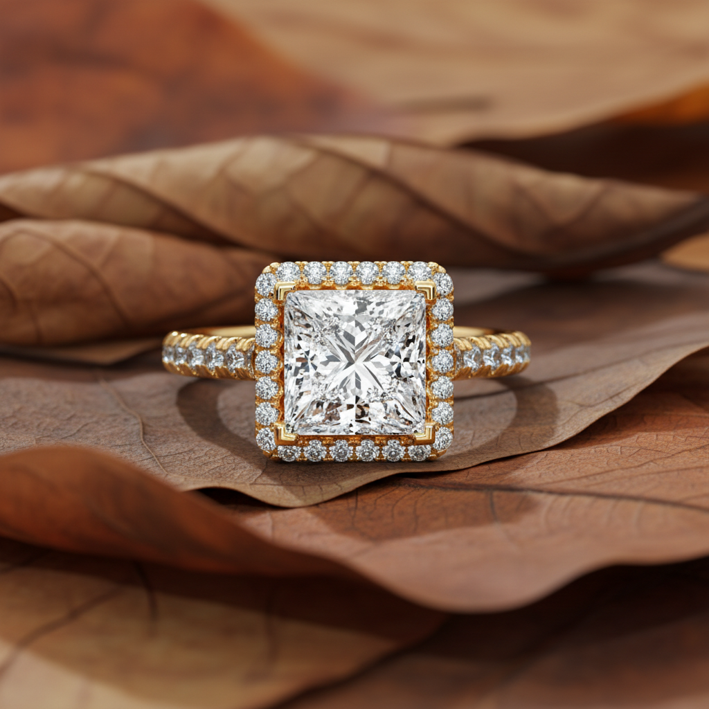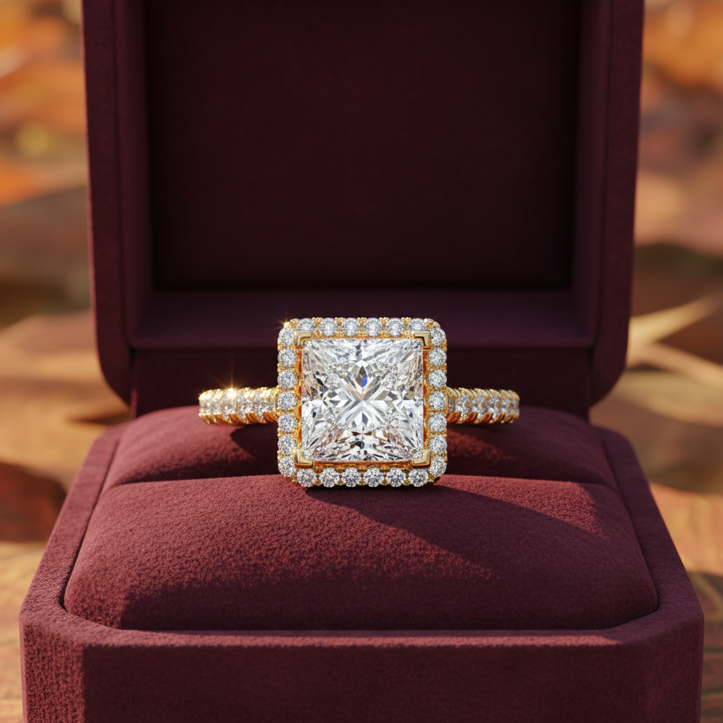 Bold yet beautifully refined, this Princess Cut Moissanite Halo Bridal Ring is designed for a love that deserves to shine brilliantly. The centerpiece features a striking 2.00 carat colorless princess-cut moissanite, admired for its crisp lines and exceptional sparkle. With VVS clarity, the center stone offers a flawless, diamond-like brilliance that captures light with stunning intensity.