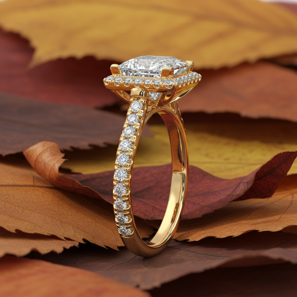 Encircled by a luminous halo of round brilliant-cut moissanite totaling 0.28 carats, the center stone is elevated with added depth, fire, and presence. The halo enhances the ring’s brilliance while maintaining a sophisticated, balanced profile perfect for the modern bride who appreciates luxury with timeless appeal.