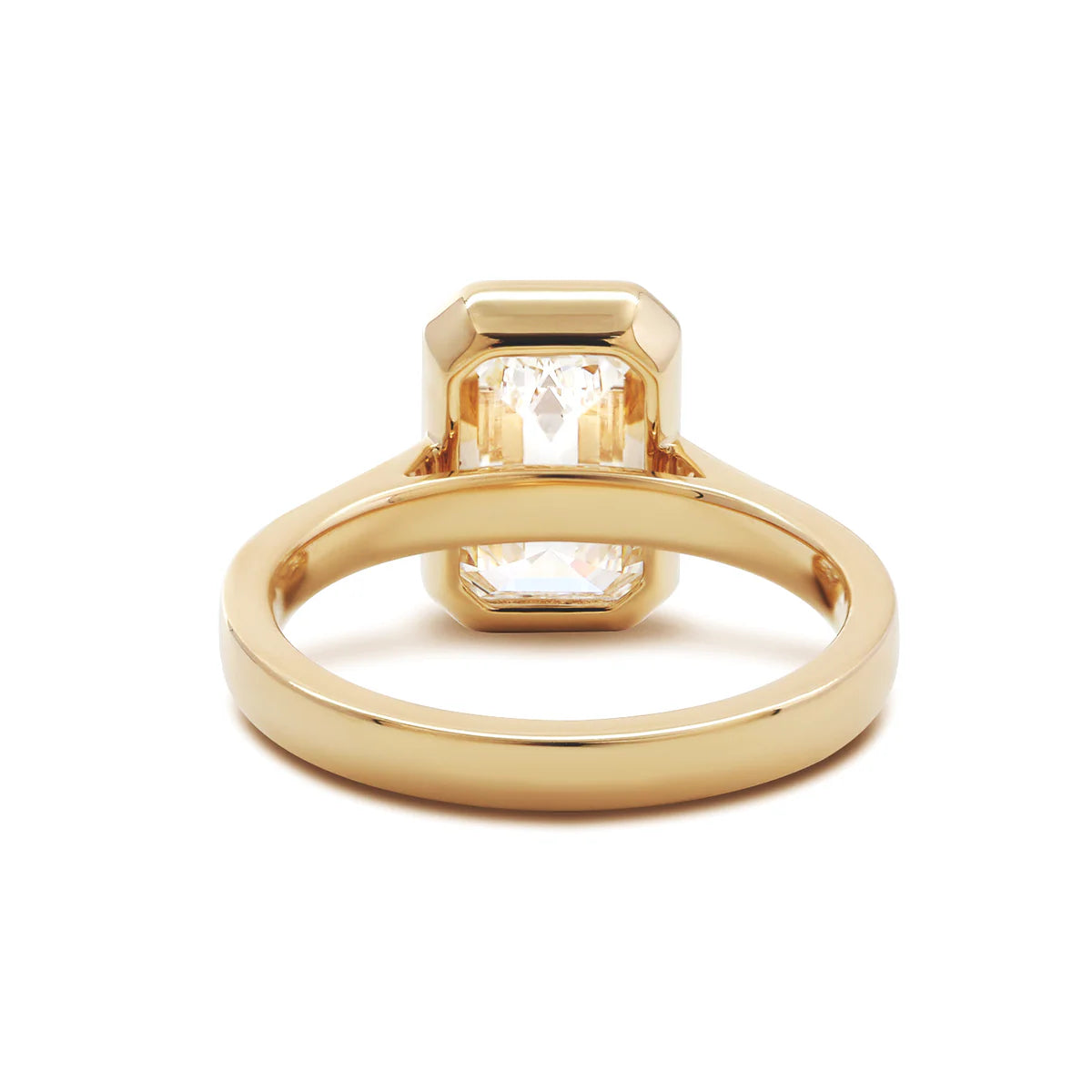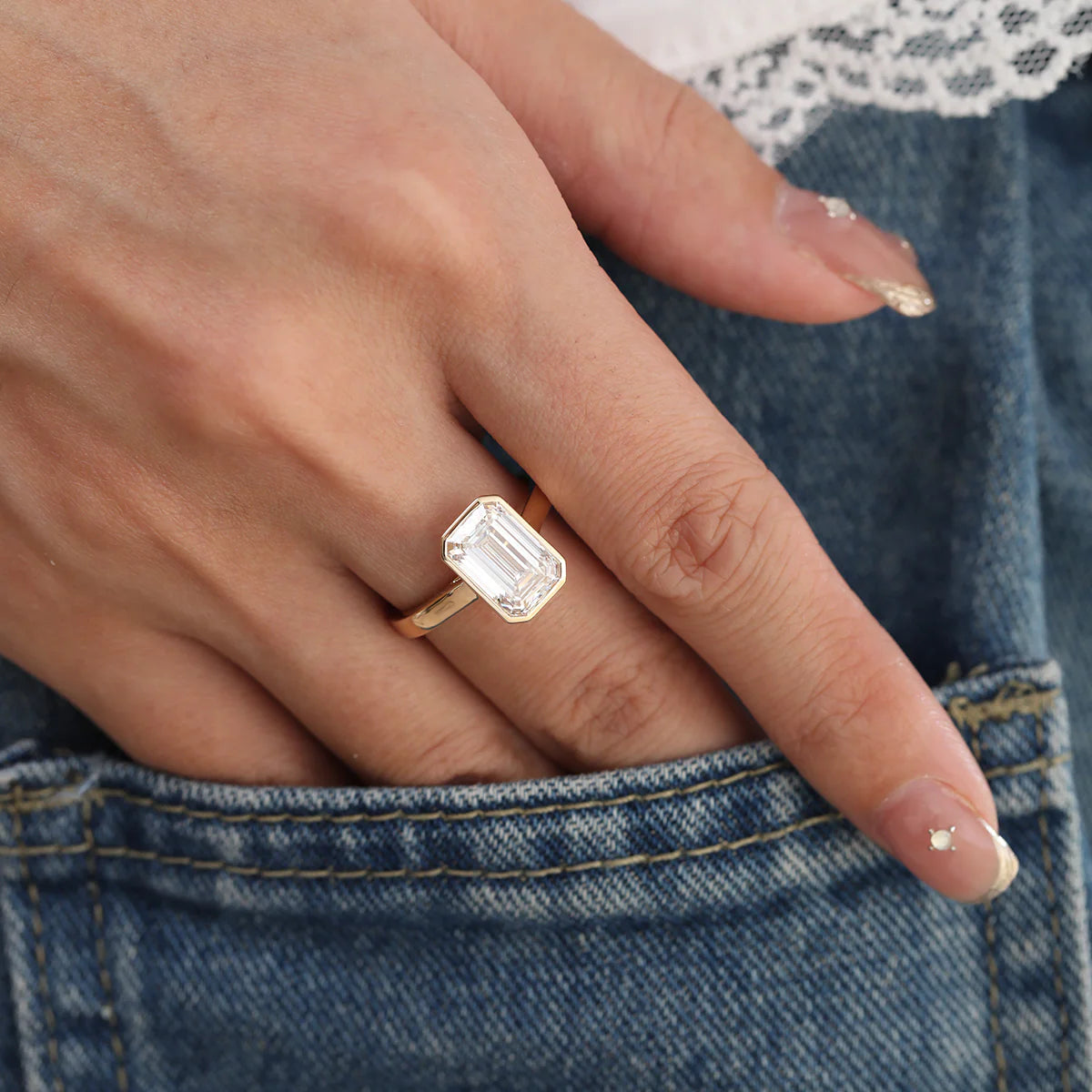 The smooth, sculpted bezel setting in 14K yellow gold frames the emerald-cut stone with contemporary elegance, offering both security and a seamless silhouette. This design creates a striking contrast between the luminous gold and the icy white moissanite, giving the ring a timeless yet modern character perfect for women who appreciate understated sophistication.