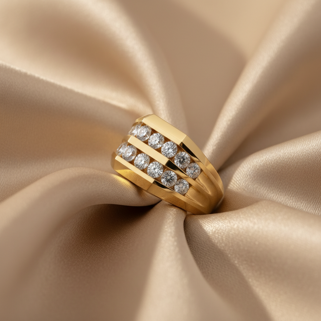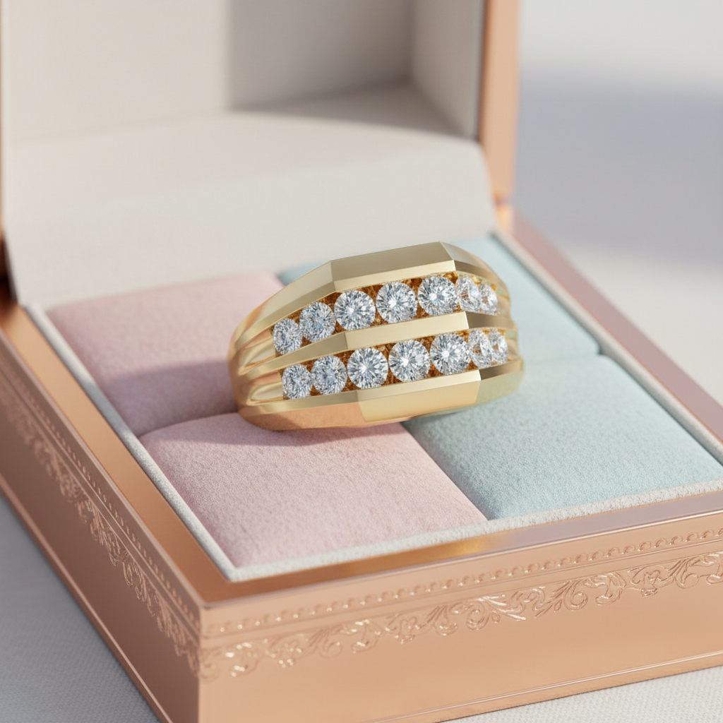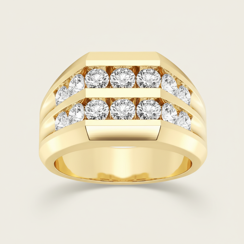 The Aurex Double-Row Moissanite Diamond Gold Ring captures the essence of structured luxury and radiant power. Expertly sculpted in luminous gold, this bold tiered band showcases two rows of round colorless moissanite stones set within sleek stepped contours, creating layered brilliance with commanding presence.