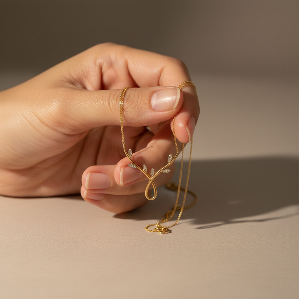 At its heart lies a colorless round-cut moissanite (0.11 CT, VVS clarity) ethically crafted to deliver exceptional brilliance and fire. The gentle leaf-inspired curves symbolize growth, grace, and timeless beauty, making this necklace perfect for everyday elegance or meaningful gifting.