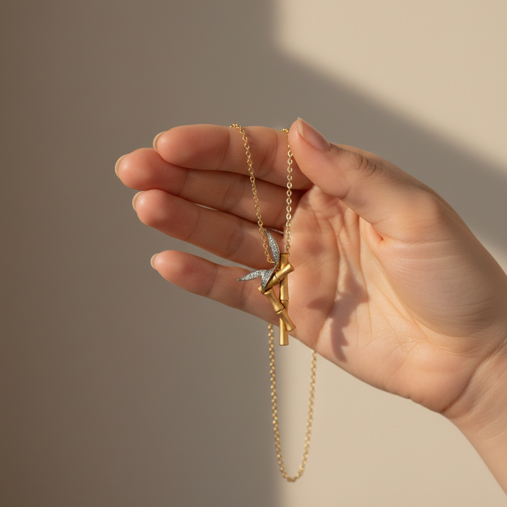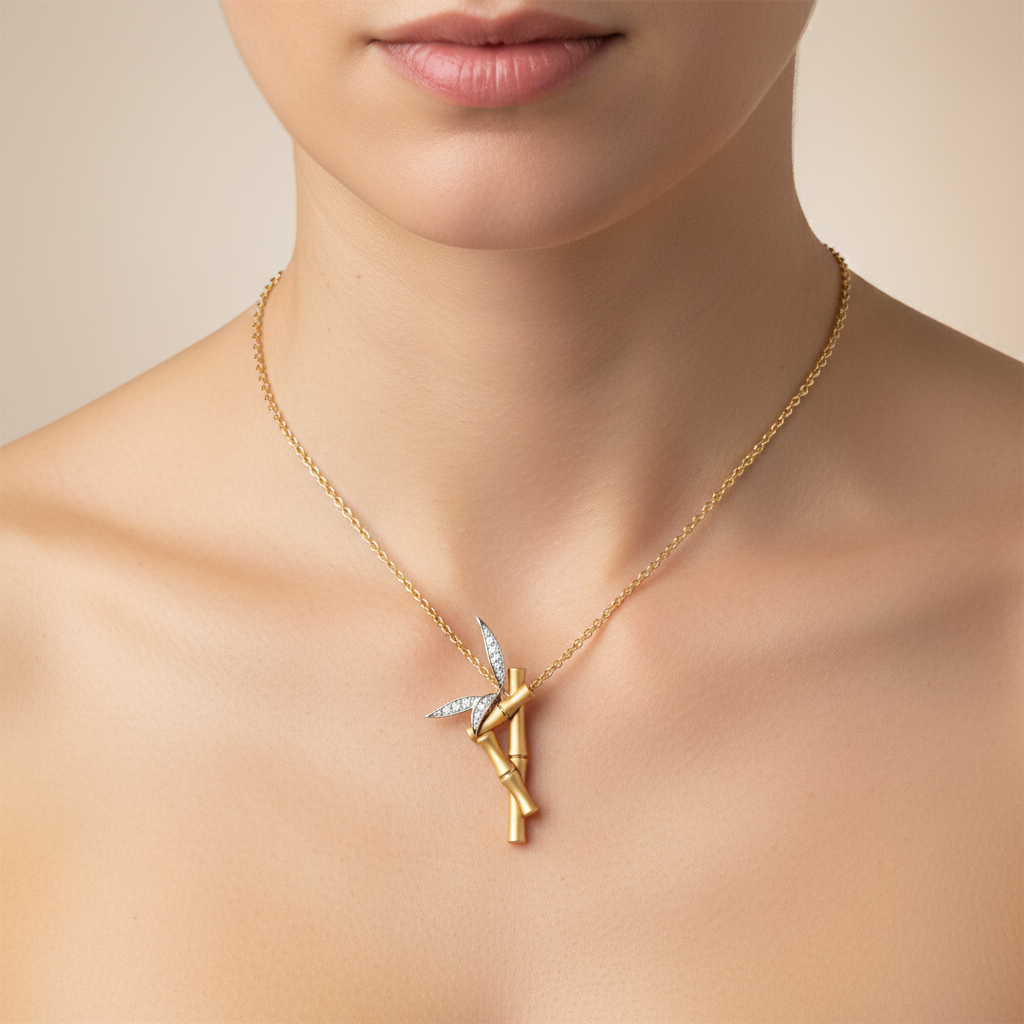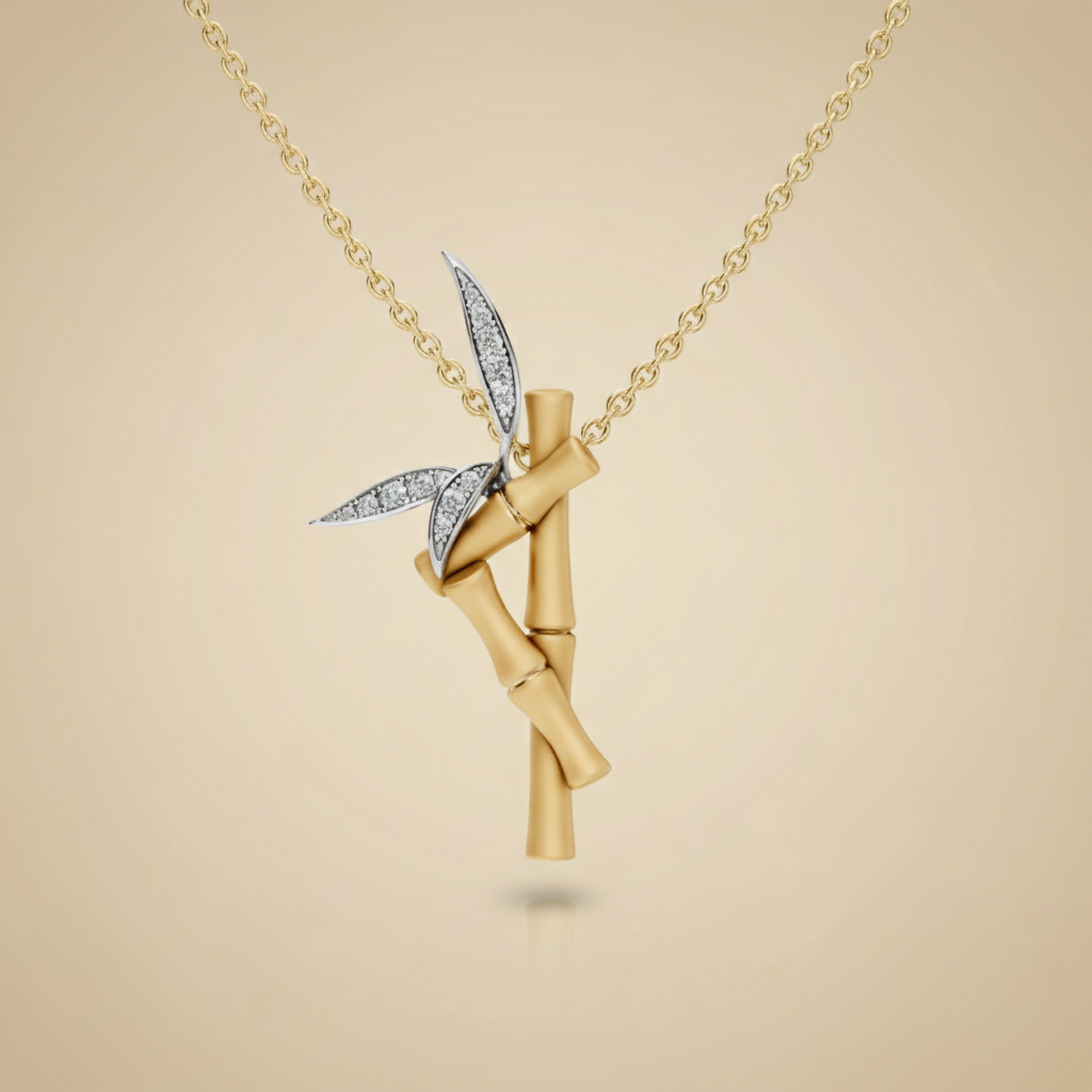 Inspired by the quiet resilience and natural beauty of bamboo, the Moissanite Bamboo Branch Gold Pendant Necklace from Yana Jewels embodies strength, flexibility, and enduring grace. Sculpted in luminous gold, the bamboo stem flows organically while delicate leaf accents shimmer with brilliant moissanite capturing the poetry of nature in fine jewelry form.