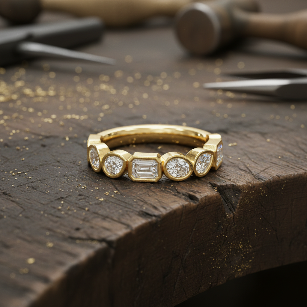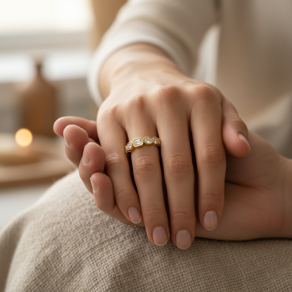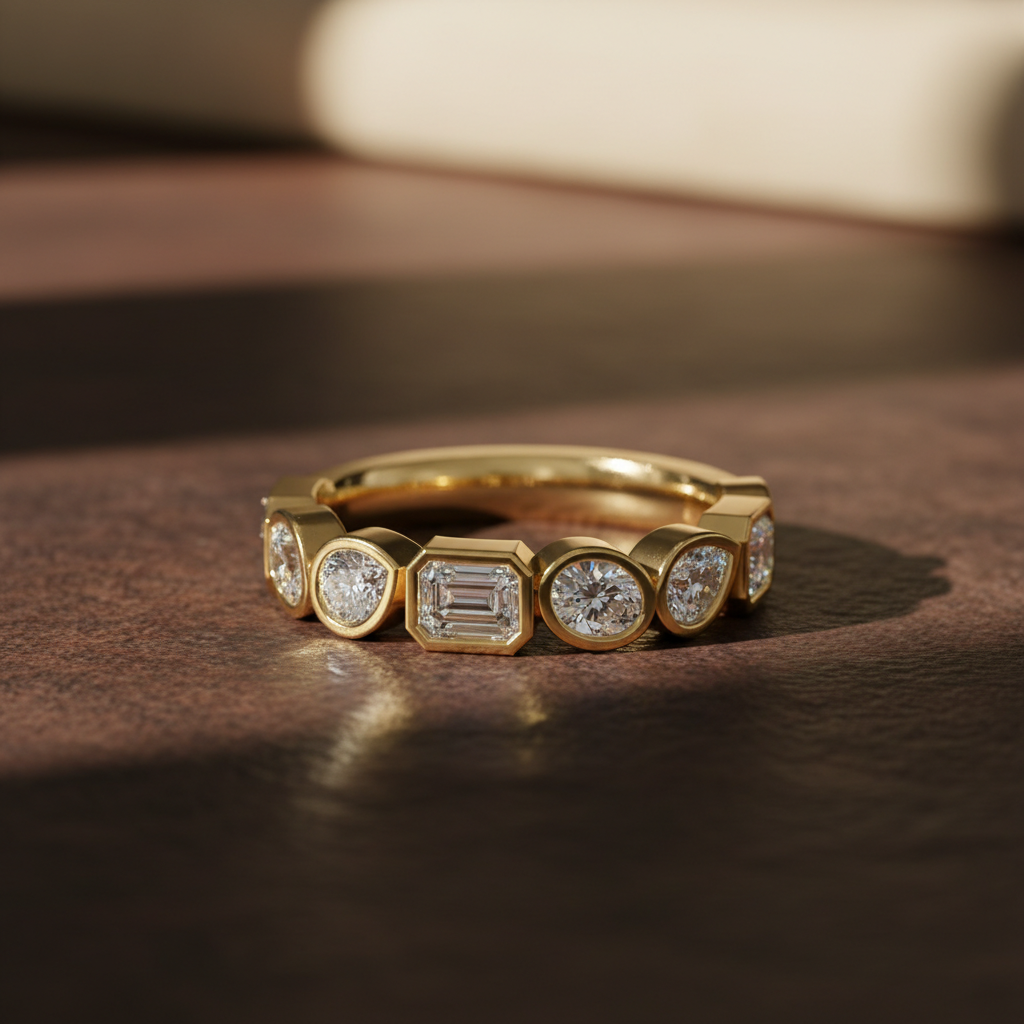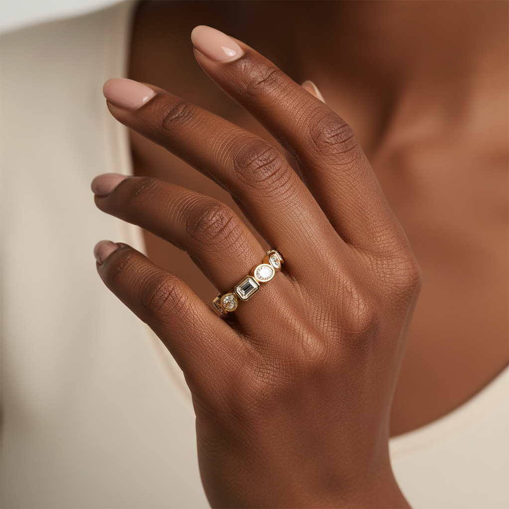 Designed for modern lifestyles, the smooth bezel setting provides a comfortable, snag-free wear ideal for everyday elegance. Whether worn as a chic wedding band, anniversary ring, or fashion-forward stacking piece, this designer band reflects Yana Jewels’ commitment to expert craftsmanship, premium materials, and responsible luxury.