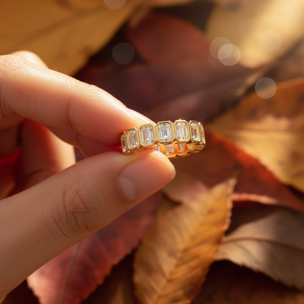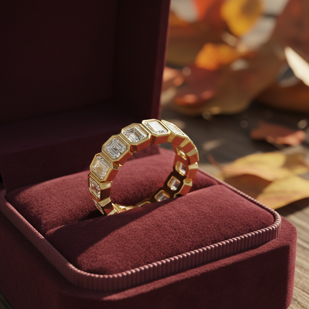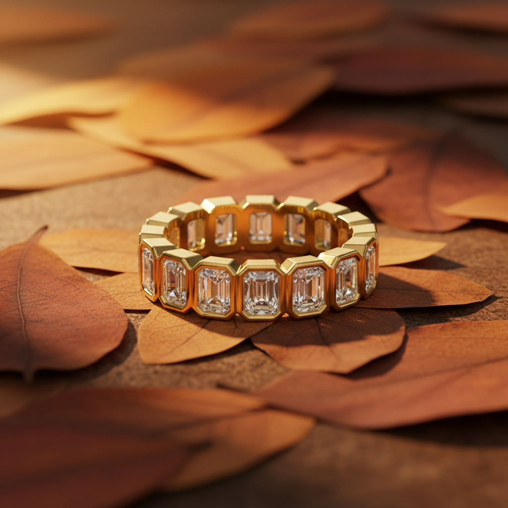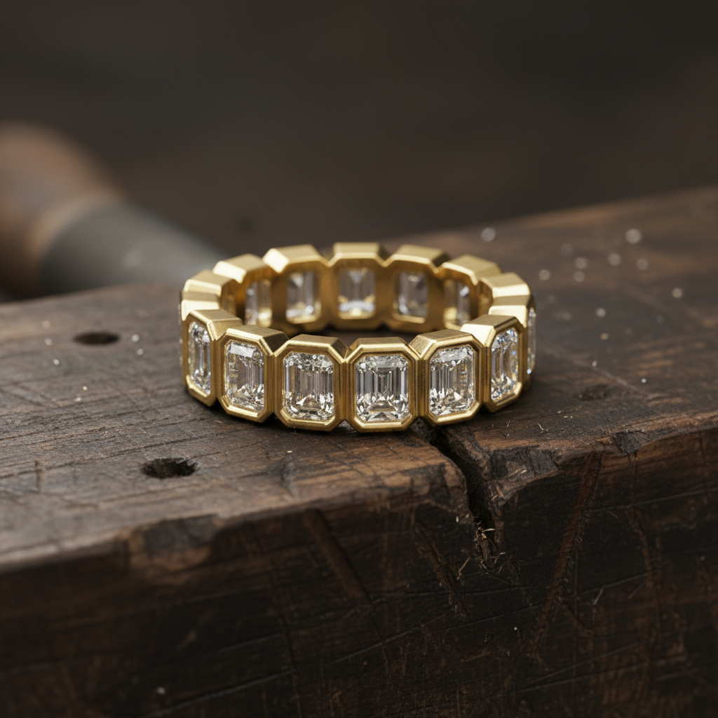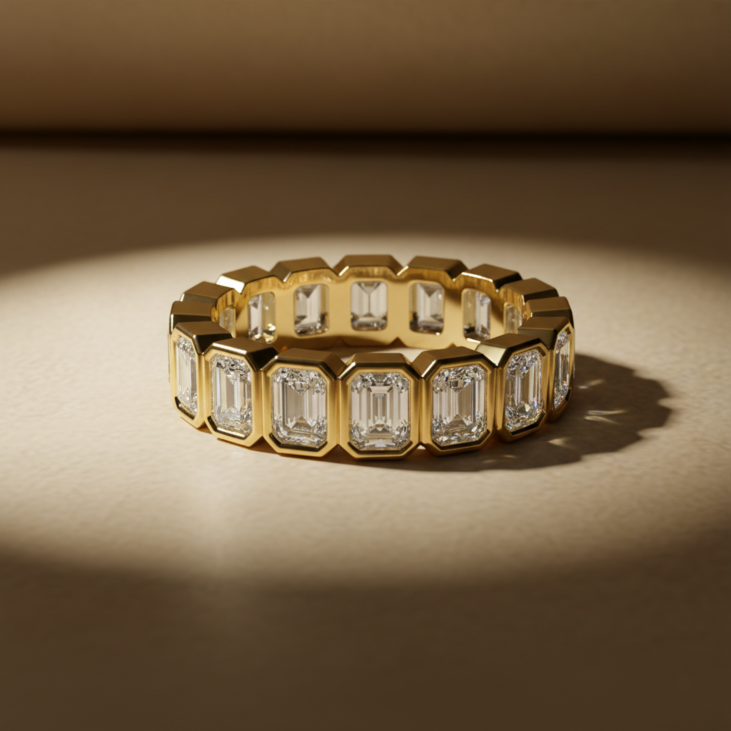 The emerald cut is celebrated for its clean lines and mirror-like facets a shape that reflects light with refined, understated brilliance. Set in a continuous eternity design, each diamond is securely framed to enhance durability while delivering a powerful, contemporary aesthetic. The structured gold setting adds dimension and depth, creating a ring that feels both substantial and sophisticated.