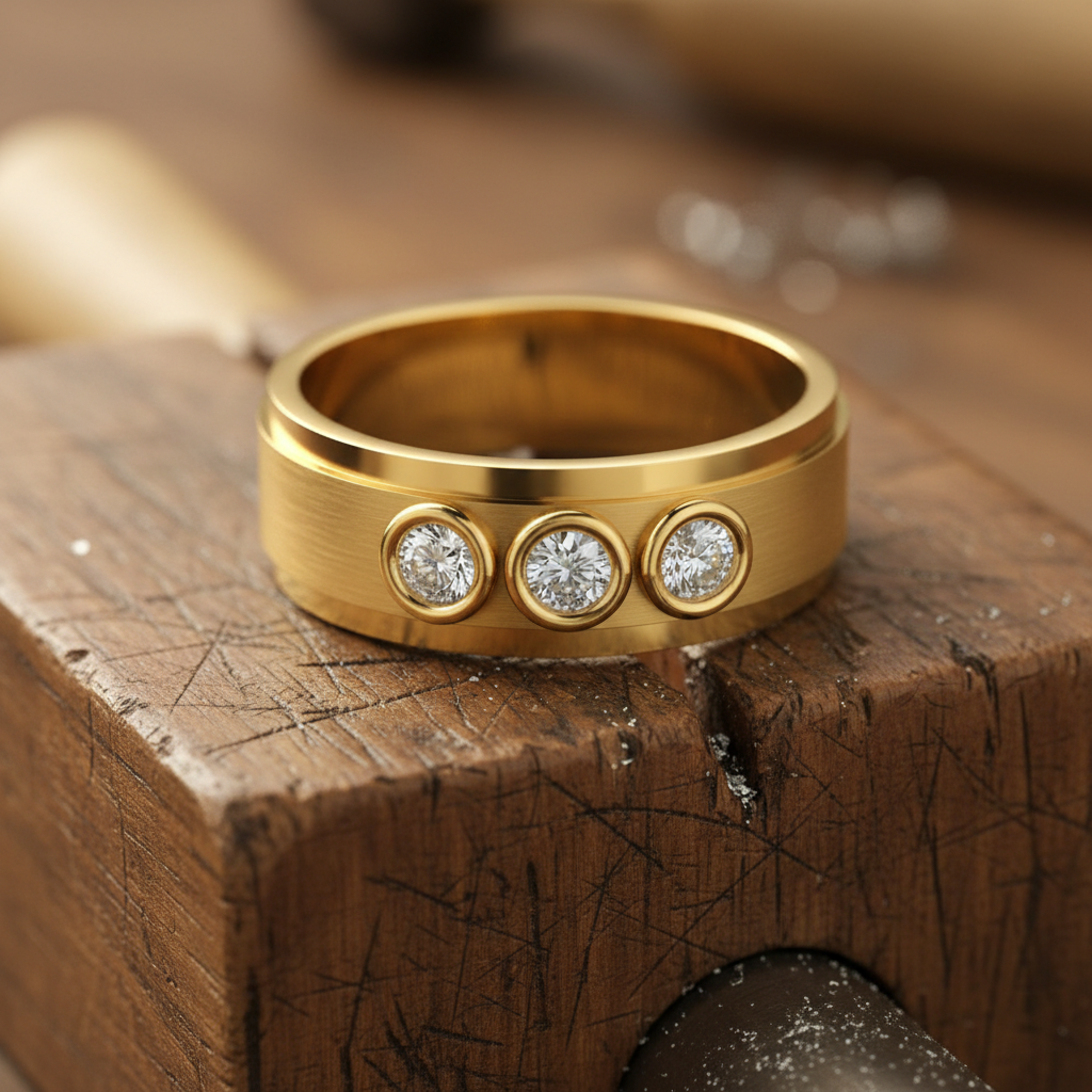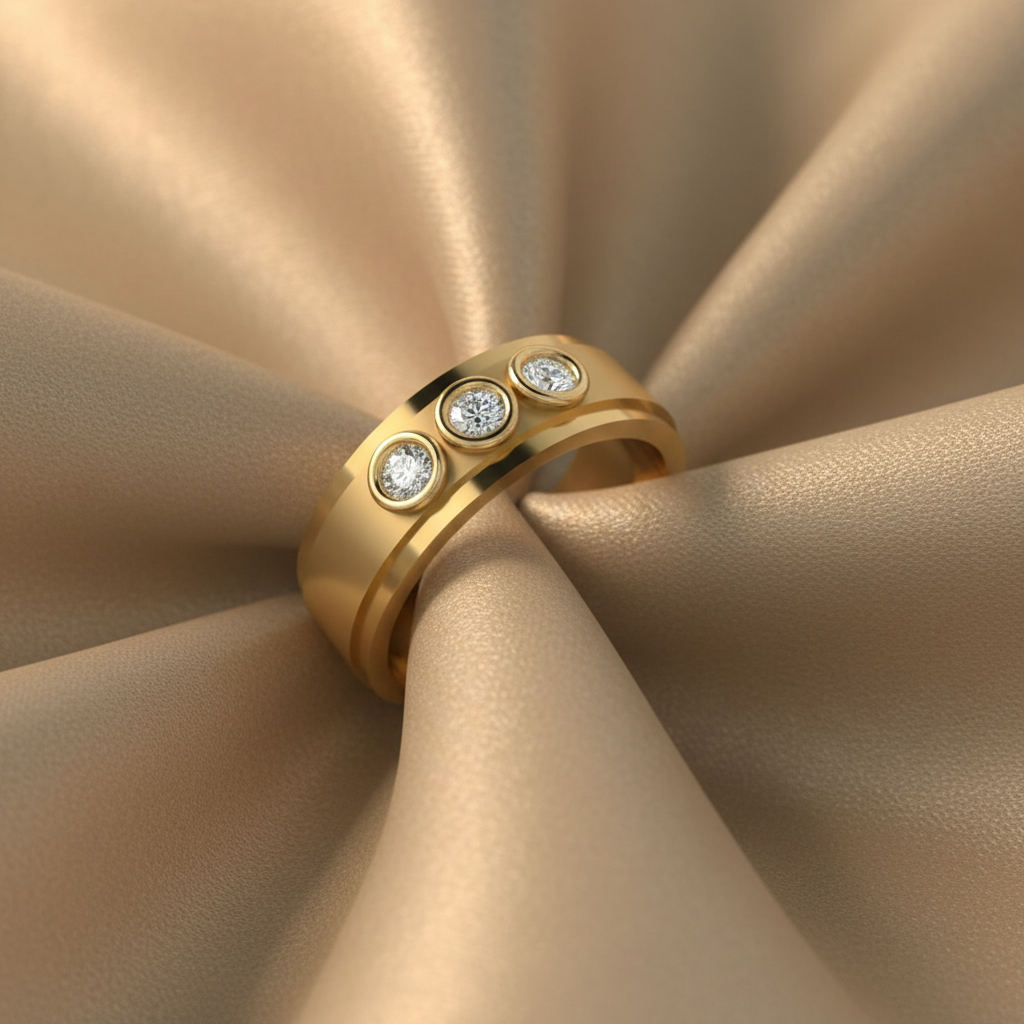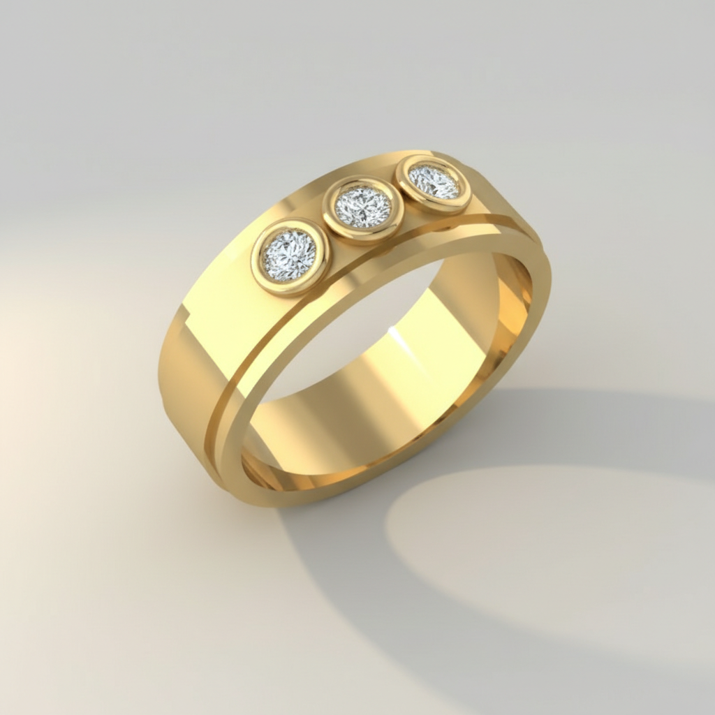 Each colorless VVS clarity diamond is expertly secured within a smooth, refined setting that enhances light performance while maintaining a strong, masculine silhouette. The trio arrangement represents past, present, and future making this piece a powerful symbol of love, growth, and personal achievement.