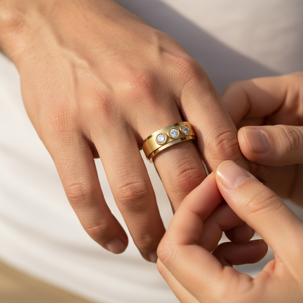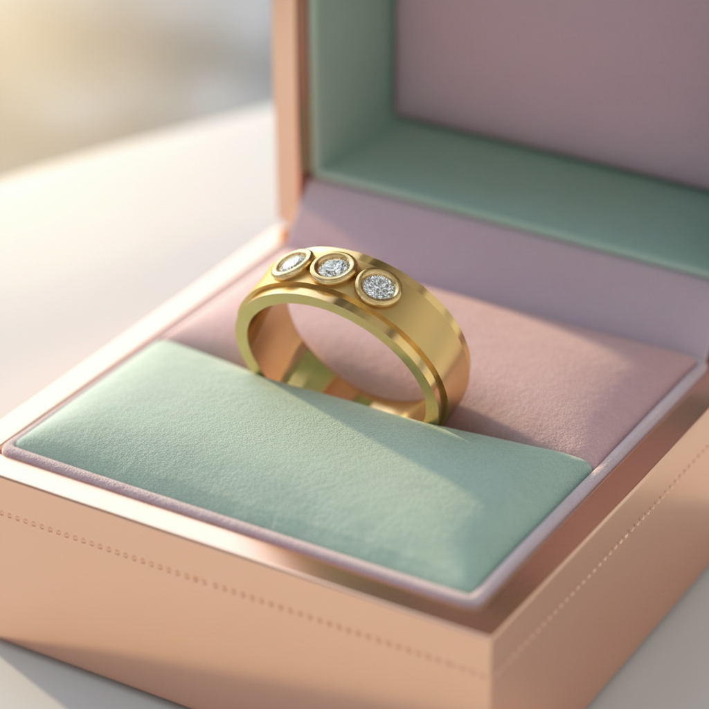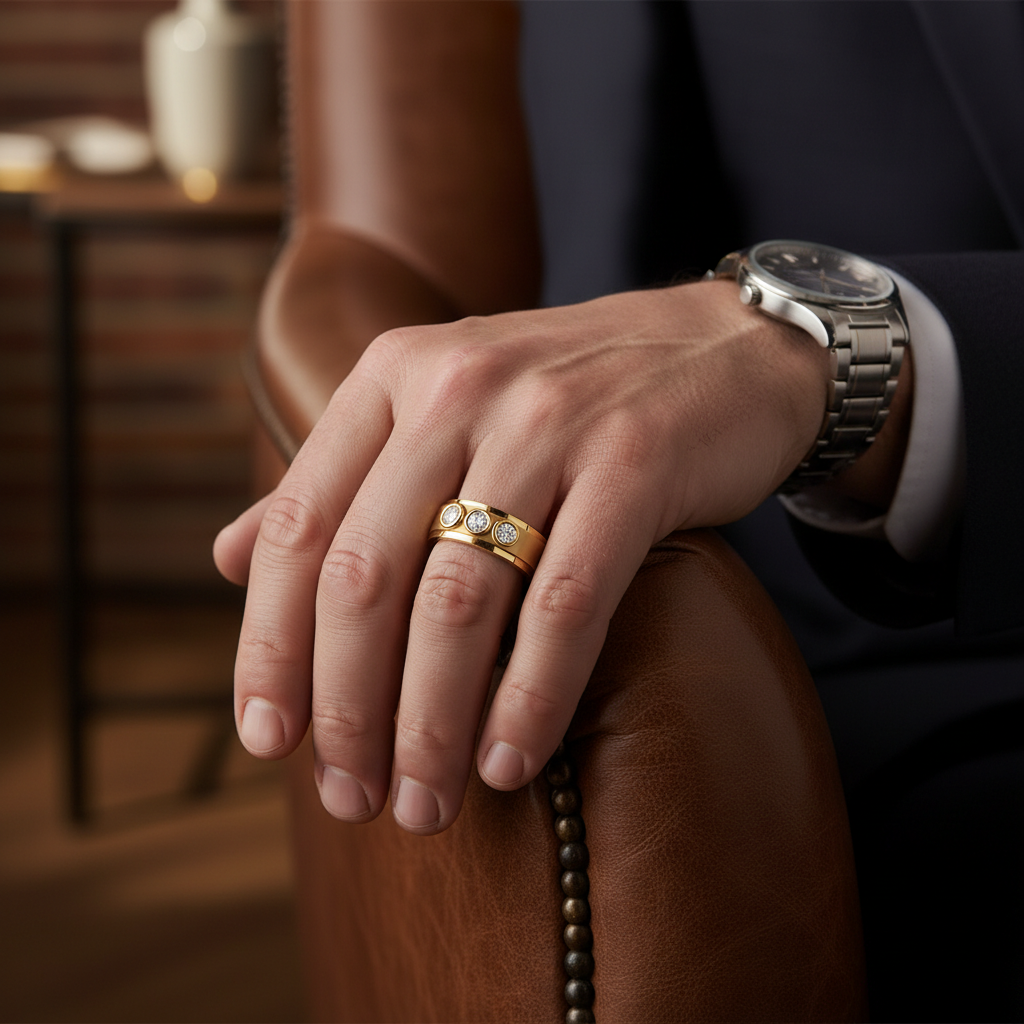 Each colorless VVS clarity diamond is expertly secured within a smooth, refined setting that enhances light performance while maintaining a strong, masculine silhouette. The trio arrangement represents past, present, and future making this piece a powerful symbol of love, growth, and personal achievement.