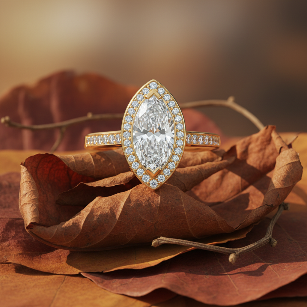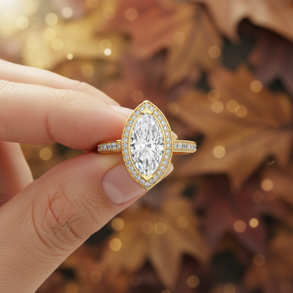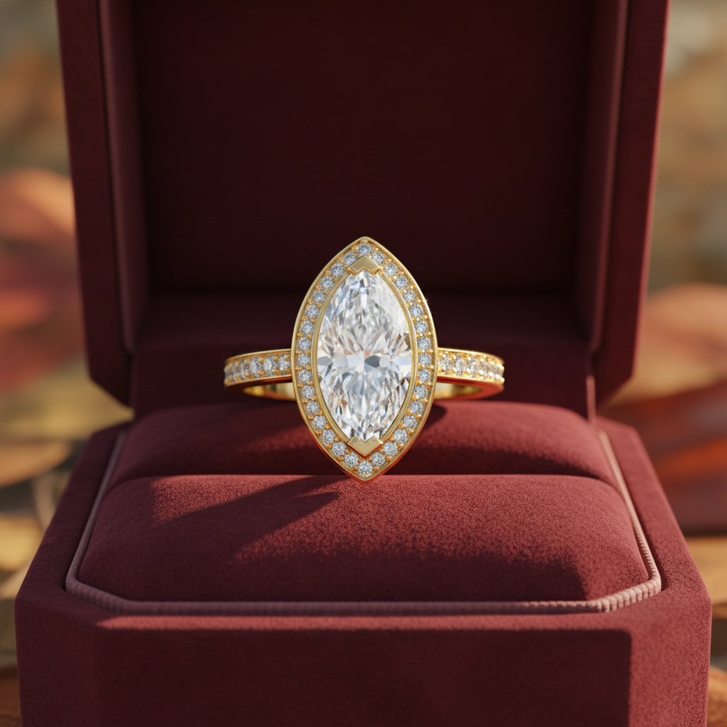 Designed to symbolize a love that is both powerful and enduring, this Marquise Cut Moissanite Channel Set Bridal Ring embodies modern luxury with timeless appeal. The centerpiece features a stunning 2.00 carat colorless marquise-cut moissanite, celebrated for its elongated shape and captivating brilliance that enhances the beauty of the hand. With exceptional VVS clarity, the center stone delivers remarkable fire and a flawless, diamond-like sparkle.