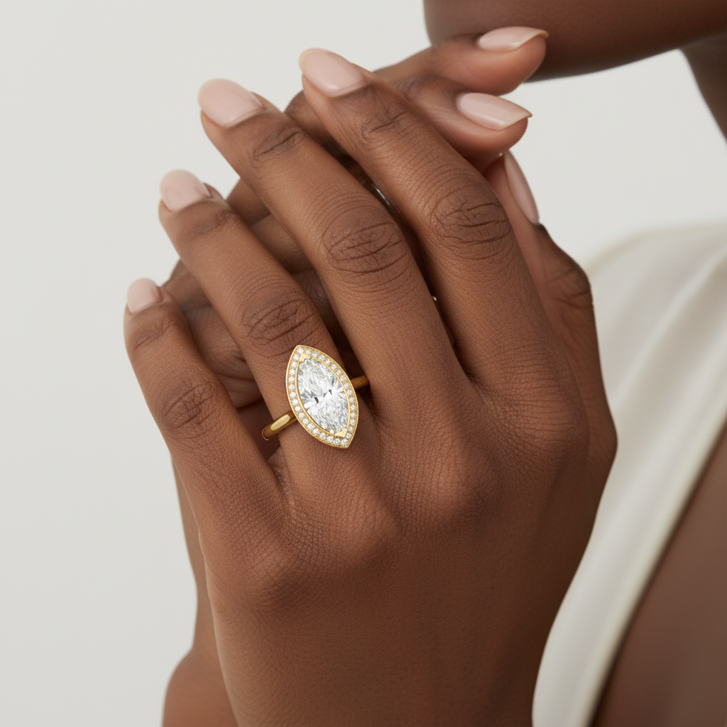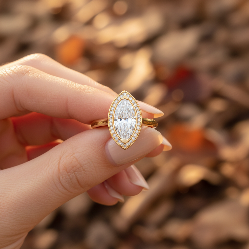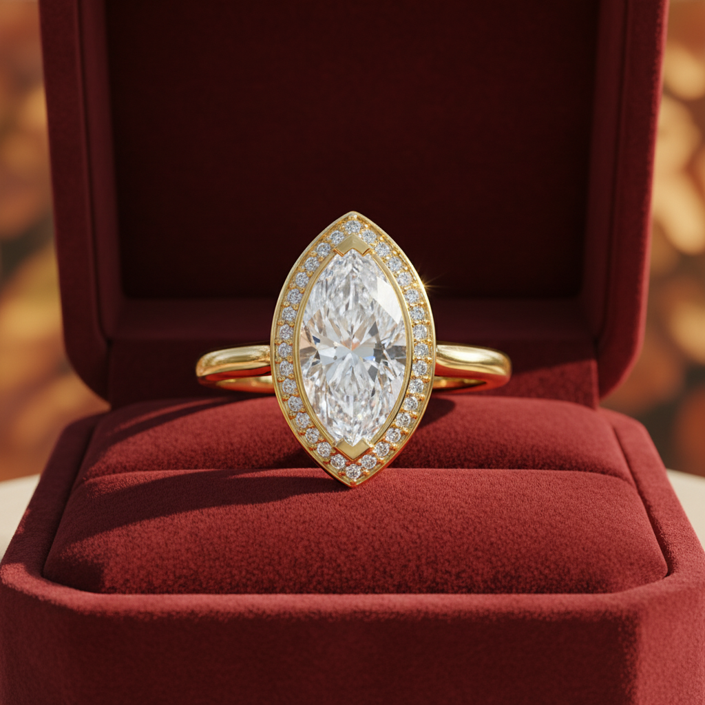 Graceful, striking, and undeniably luxurious, this Marquise Cut Moissanite Channel Set Wedding Ring is designed for the bride who appreciates refined beauty with a modern edge. At its heart lies a captivating 2.00 carat colorless marquise-cut moissanite, chosen for its elongated silhouette and exceptional fire that flatters the hand with effortless elegance. With VVS clarity, the center stone delivers breathtaking sparkle and diamond-like brilliance.