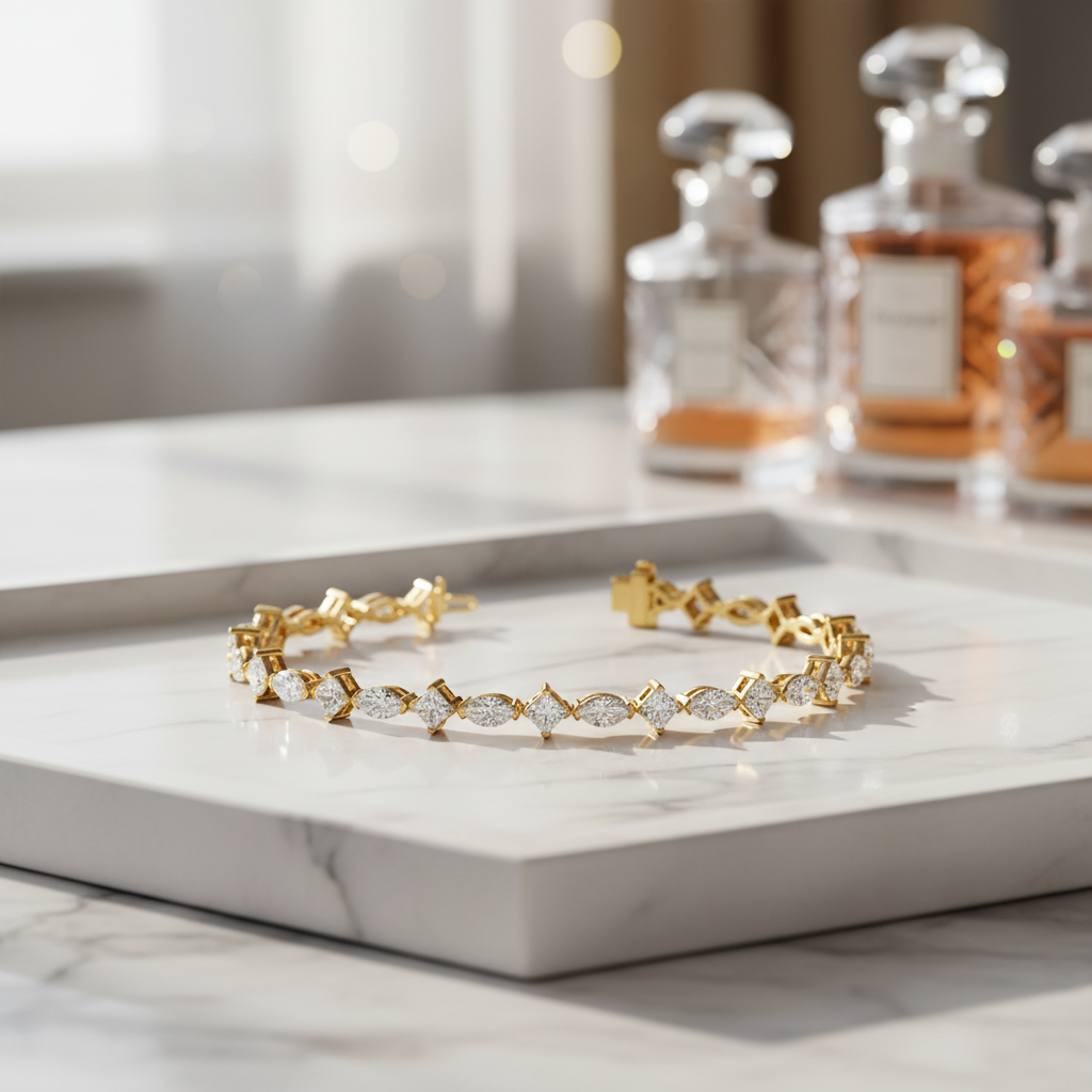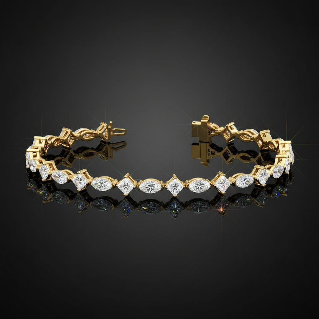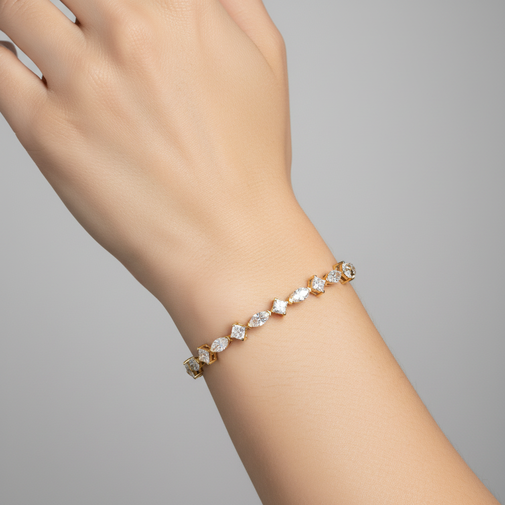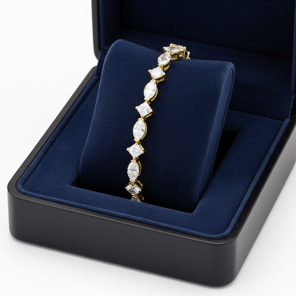 The alternating marquise and princess cuts create a distinctive rhythm of light and shape, offering a bold yet graceful aesthetic that sets this bracelet apart. Expertly crafted to drape effortlessly around the wrist, it blends classic tennis bracelet sophistication with a modern, fashion-forward edge perfect for the woman who appreciates both tradition and innovation.