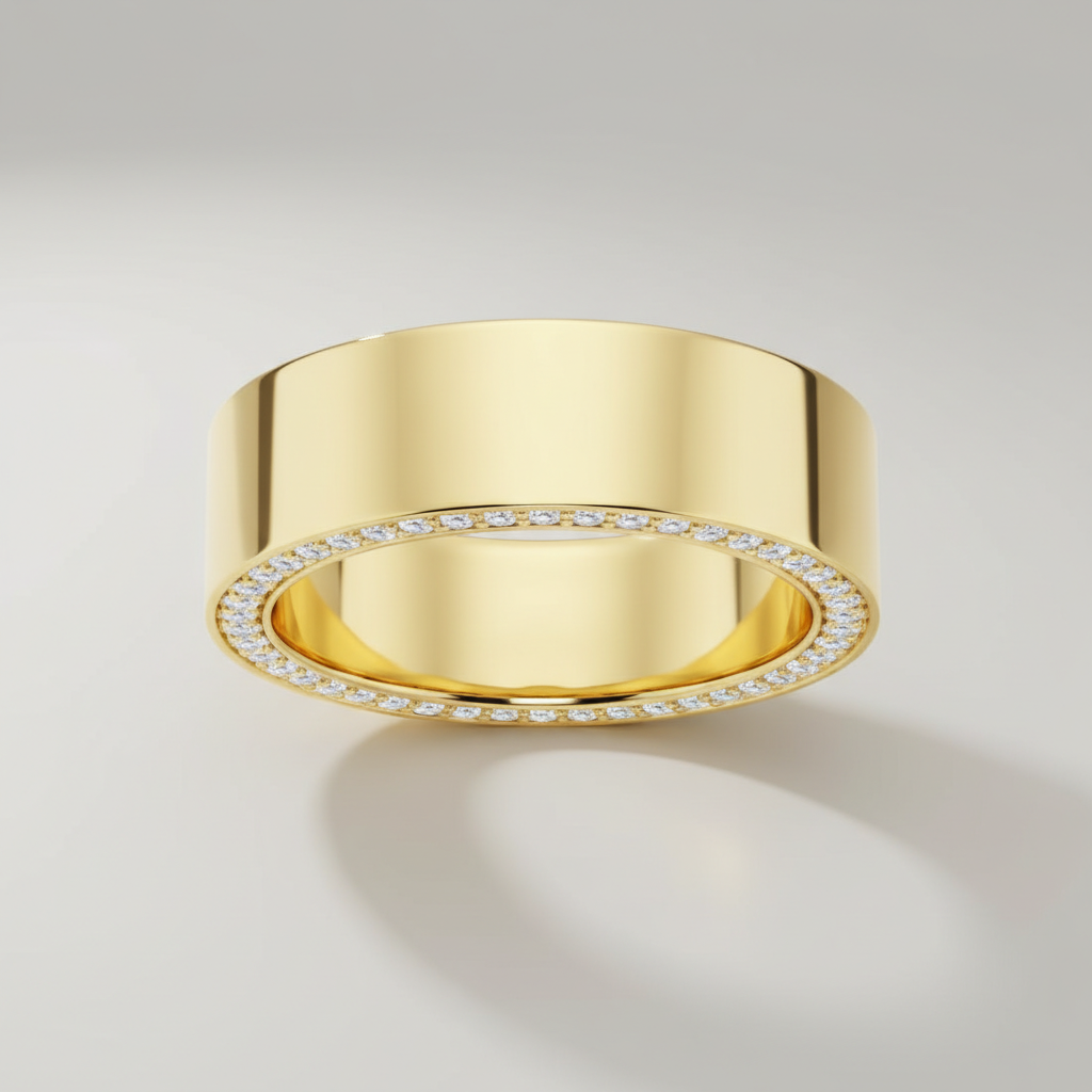 Designed for the modern gentleman, this gold wedding ring embodies understated luxury with a deeply personal touch. Its clean, polished exterior reflects strength and timeless style, while the interior reveals a hidden halo of colorless round moissanite brilliance meant solely for the wearer.