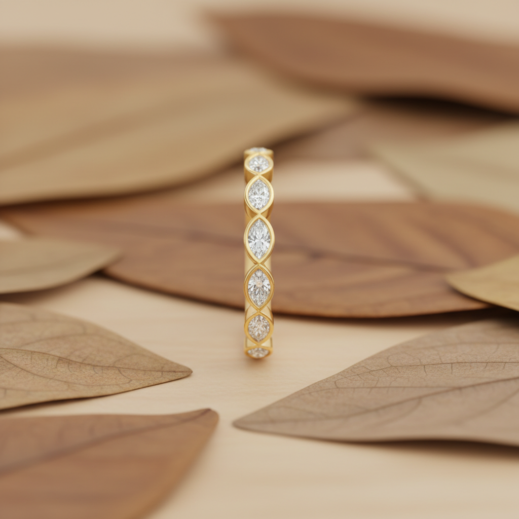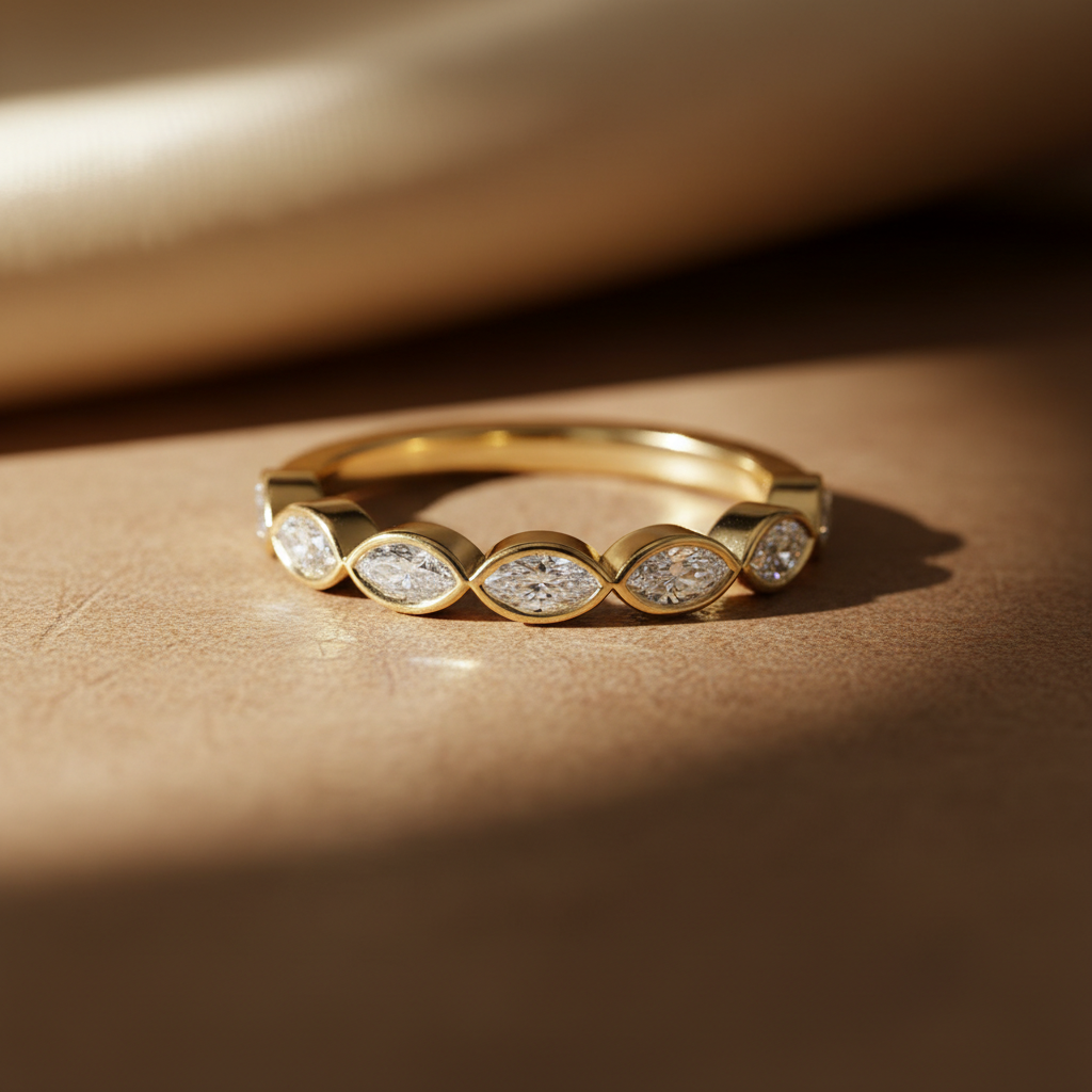 Refined minimalism meets radiant brilliance in the Modern Marquise Moissanite Half Eternity Gold Band. A graceful sequence of marquise-cut colorless moissanite stones flows along the band, each precisely set to highlight the elongated silhouette and maximize light reflection. The result is a clean, contemporary sparkle that feels both sophisticated and effortlessly wearable.