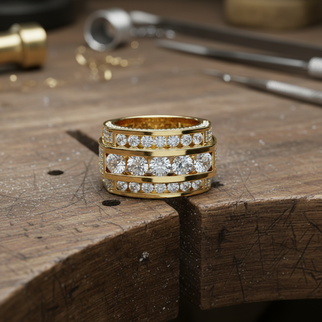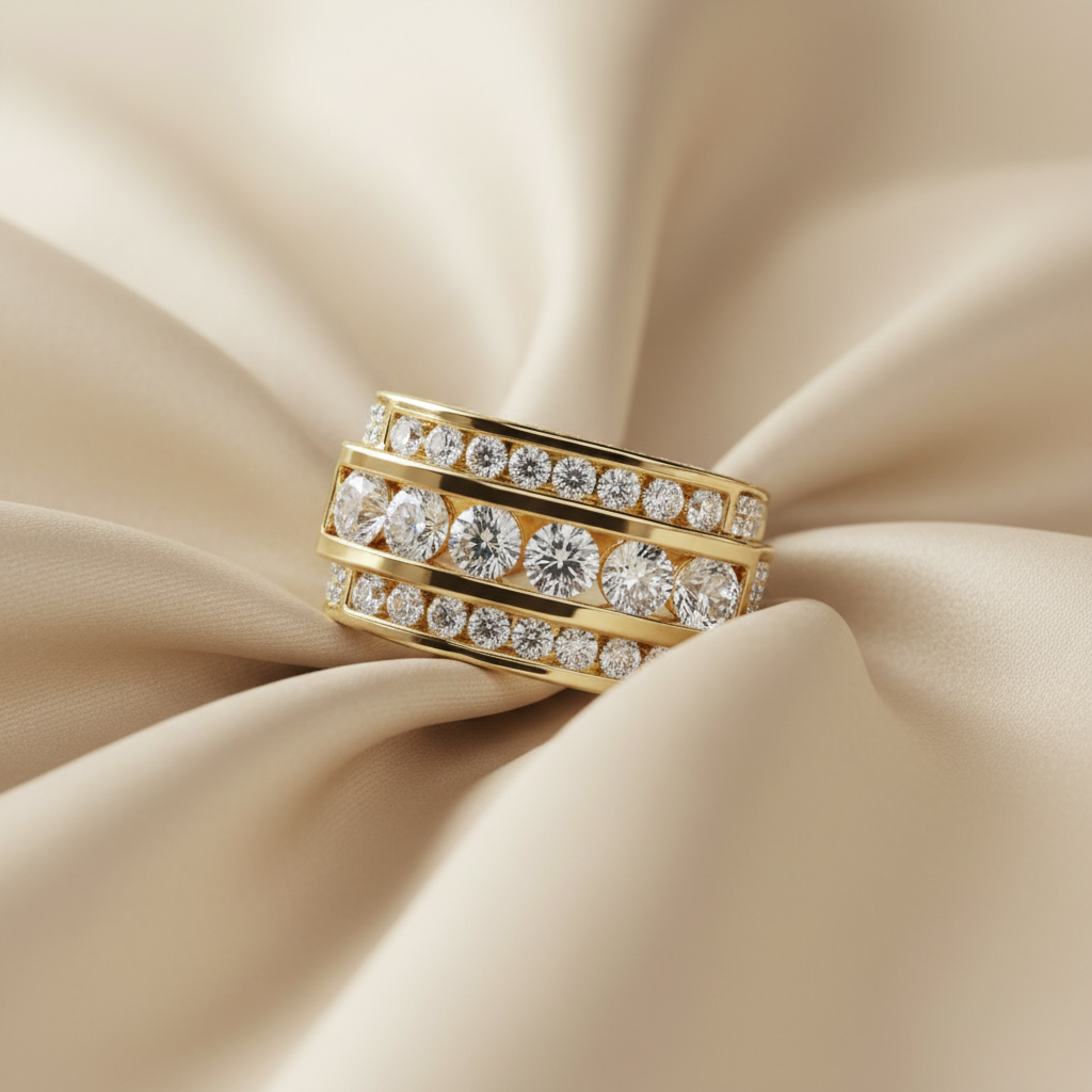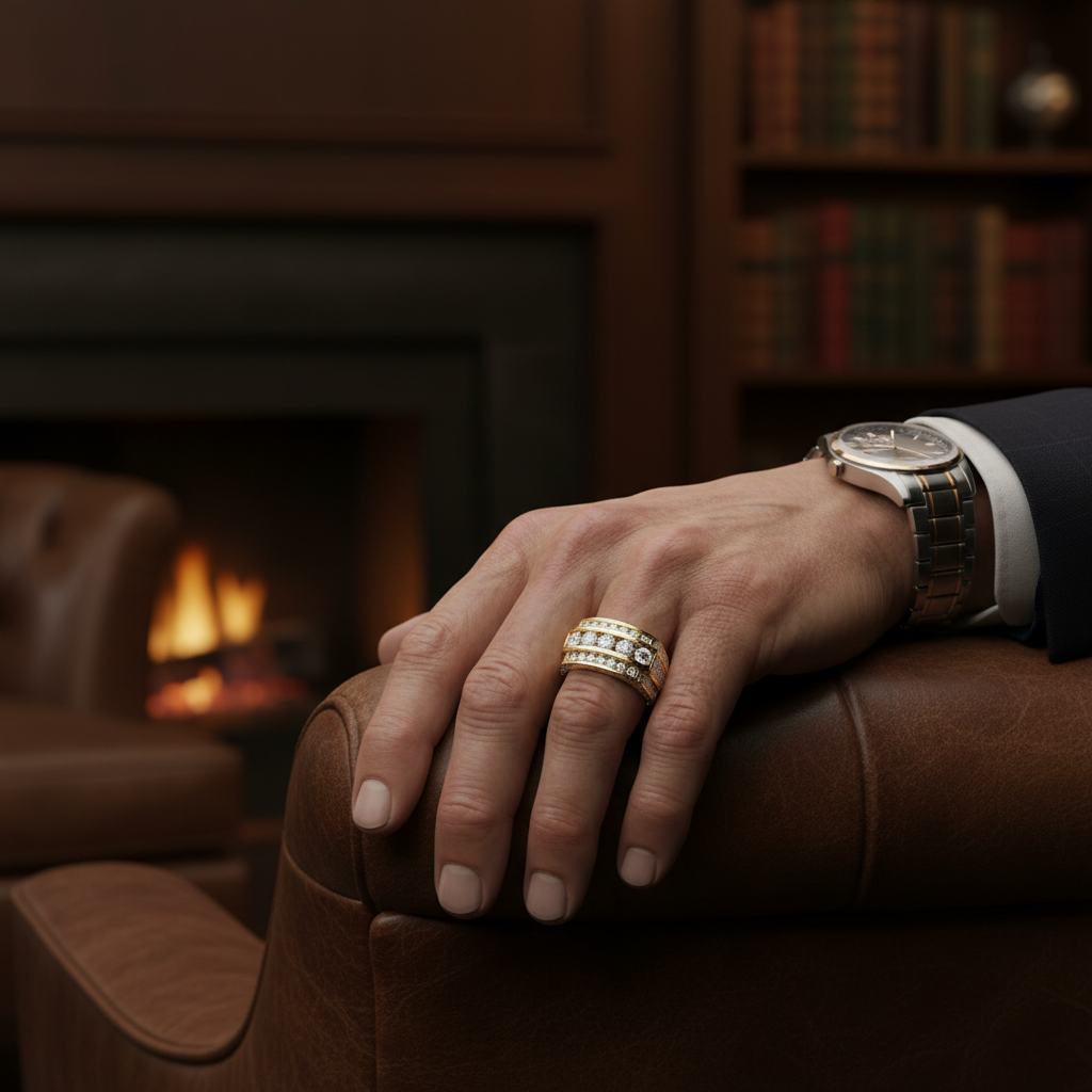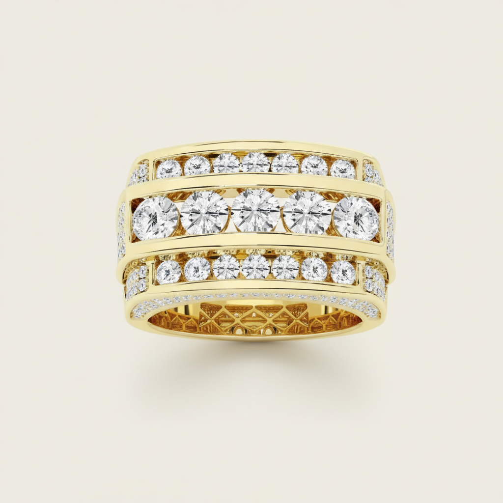 Expertly crafted in solid gold with intricate inner detailing and a mirror-bright finish, the Monarch ring embodies heirloom craftsmanship and contemporary luxury. Whether worn as a statement wedding band, milestone anniversary ring, or signature collector’s piece, it symbolizes strength, prestige, and enduring brilliance.