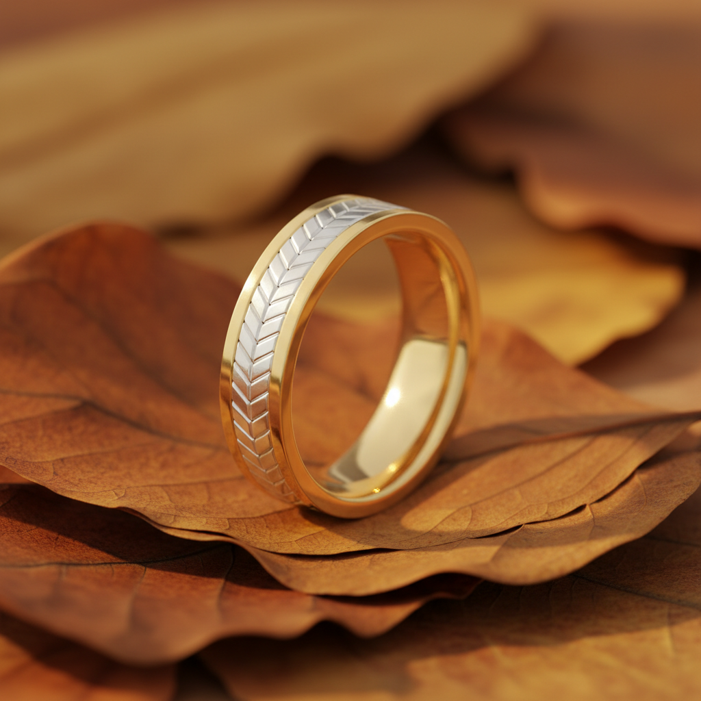 Celebrate a love that is both strong and graceful with the Regal Feather Pattern Two-Tone Wedding Band from Yana Jewels. Designed with a striking contrast of warm yellow gold and luminous white gold, this sophisticated band features an intricately engraved feather motif that symbolizes harmony, protection, and enduring commitment.