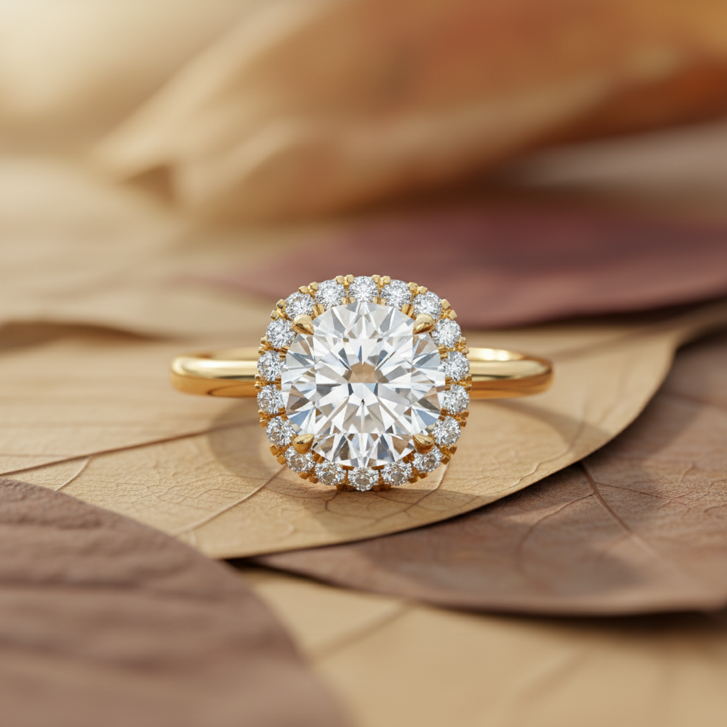 Encircling the center stone, a delicate halo of round brilliant-cut moissanite side stones adds depth, dimension, and luminous beauty from every angle. Thoughtfully crafted for brides who value sophistication, sustainability, and superior craftsmanship, this ring offers a bold yet elegant presence on the hand.