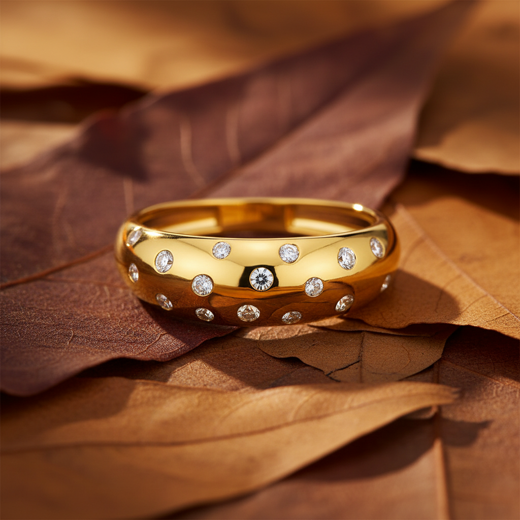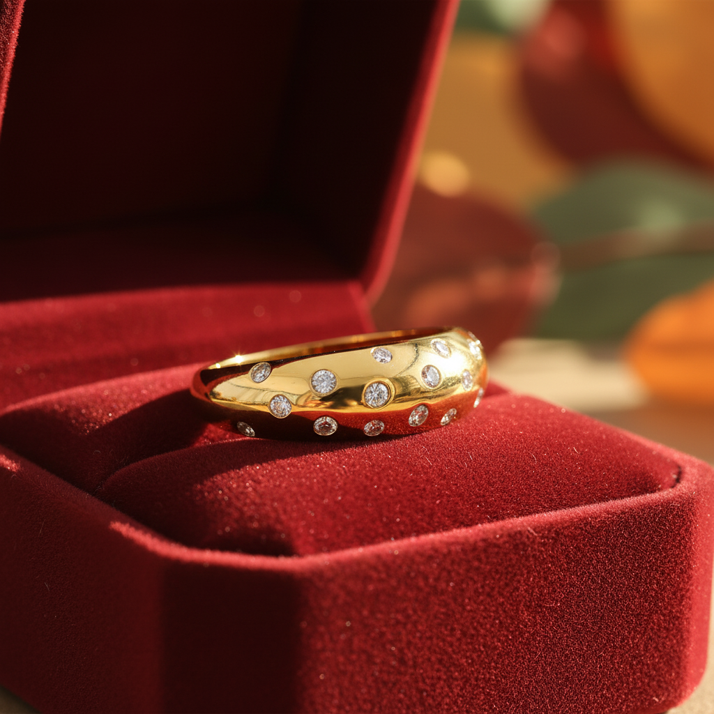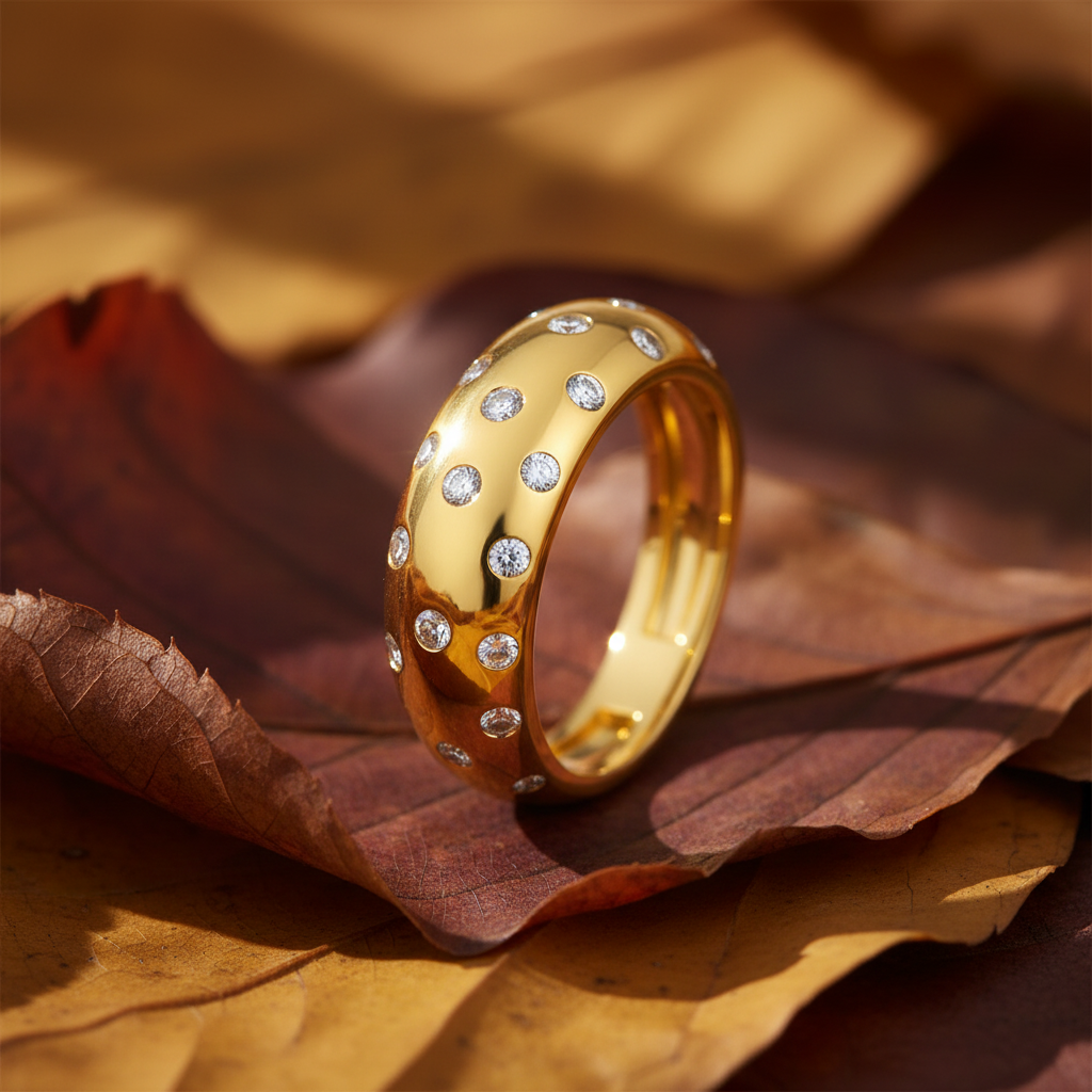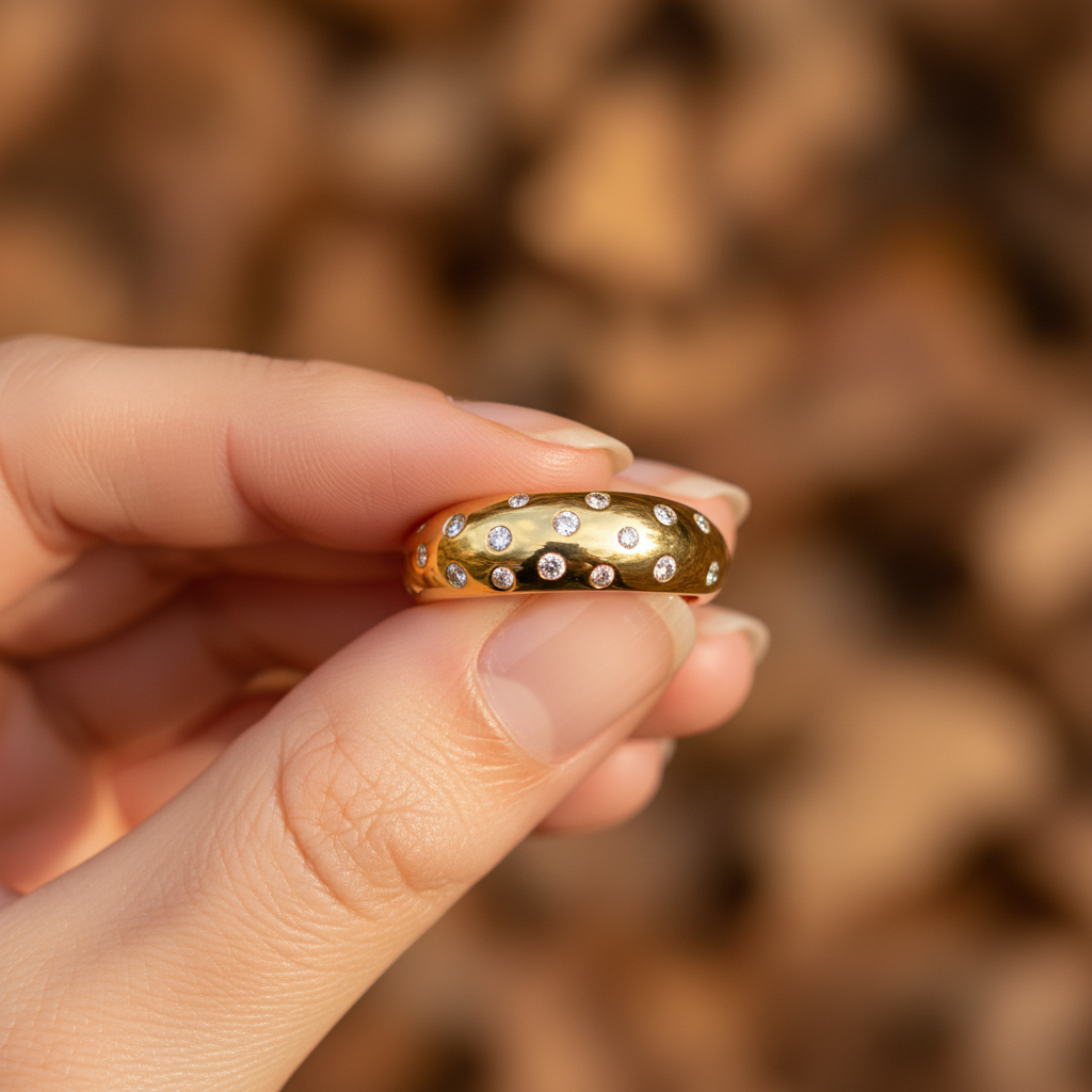 The distinctive dome bubble band adds dimension and character, creating a bold yet wearable statement that transitions effortlessly from day to evening. Perfect for stacking or wearing solo, this ring is designed for the modern American woman who values individuality, craftsmanship, and conscious luxury.