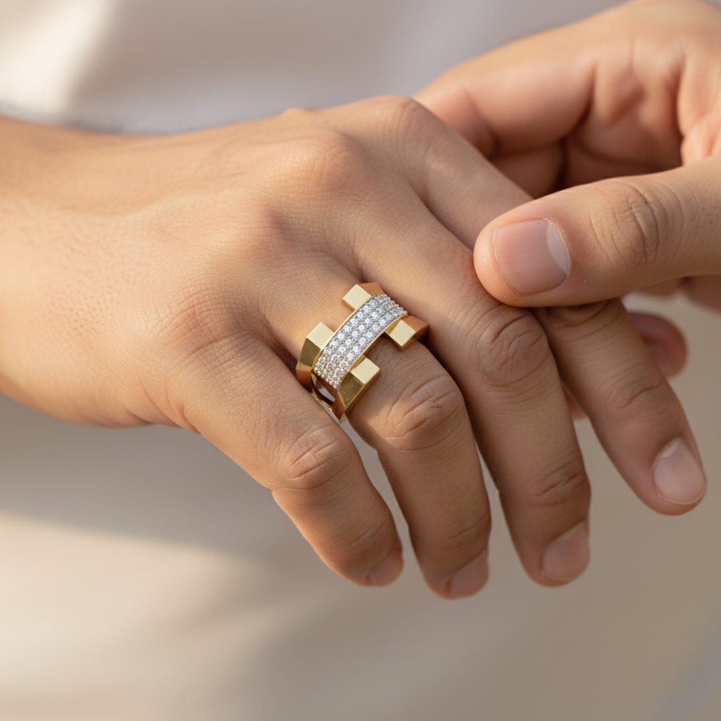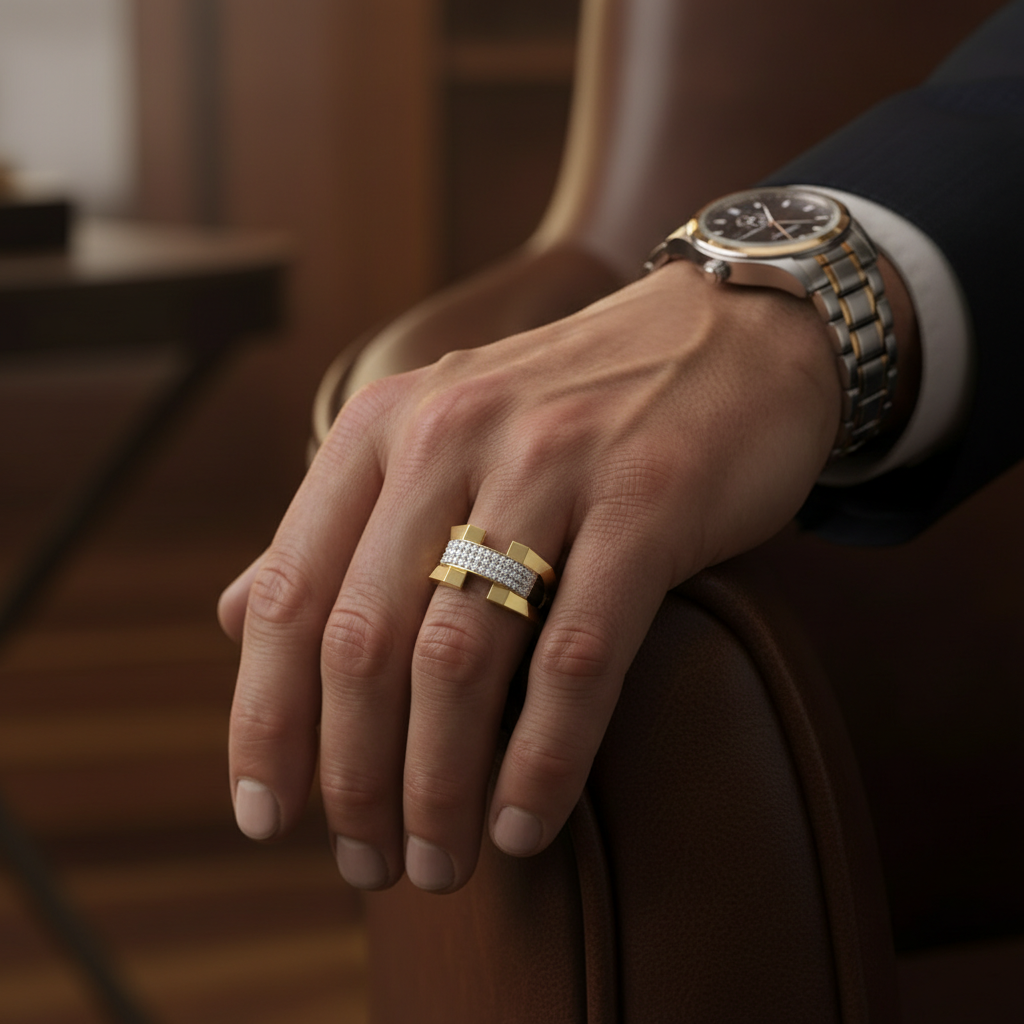 Designed for the contemporary gentleman, this ring blends durability with elevated aesthetics. The pave surface delivers continuous shimmer without overwhelming the strong, masculine silhouette making it ideal as a statement ring, anniversary band, or milestone celebration piece.