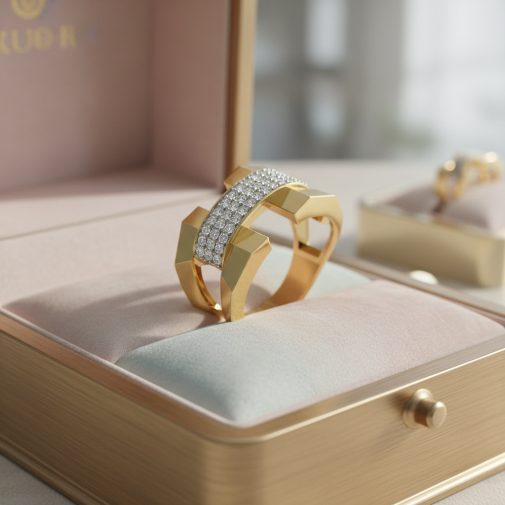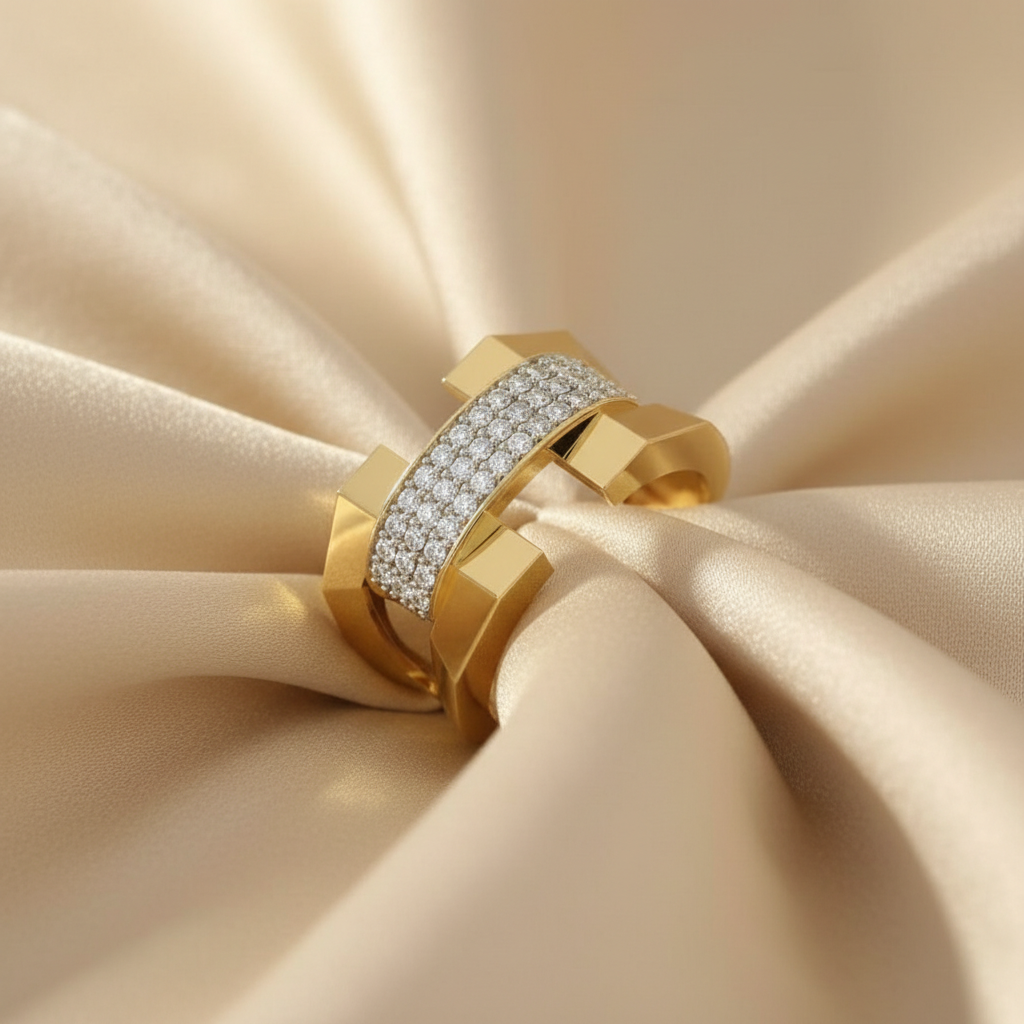 Each colorless VVS clarity diamond is precision-set to maximize light reflection while maintaining a seamless, structured finish. The bold architectural gold frame enhances the sparkle, creating a powerful contrast between polished metal and radiant stones.