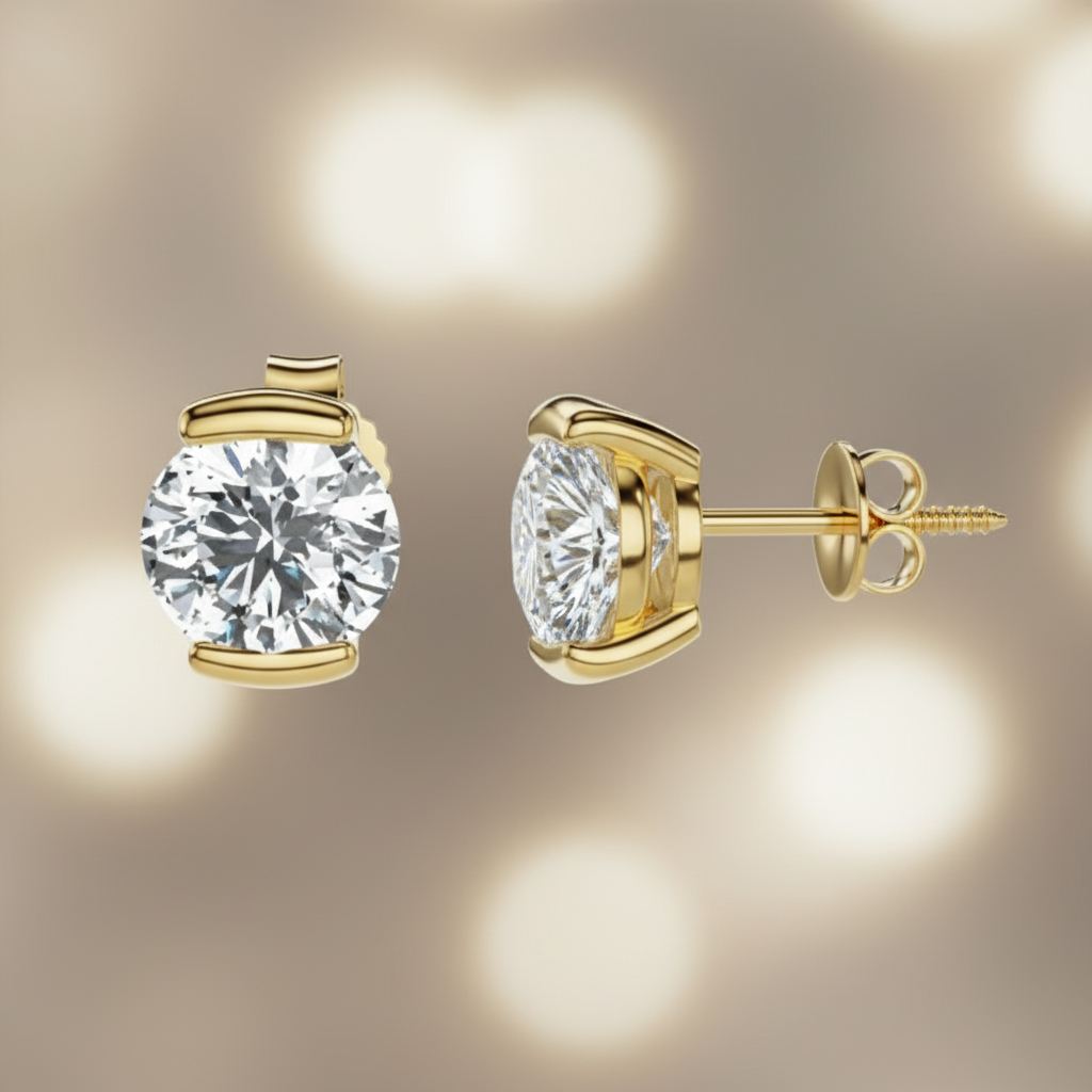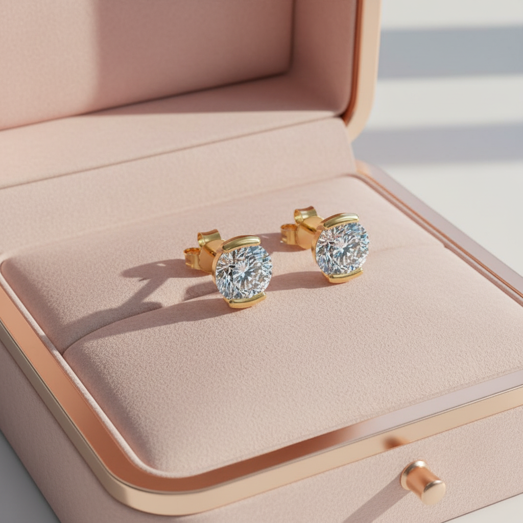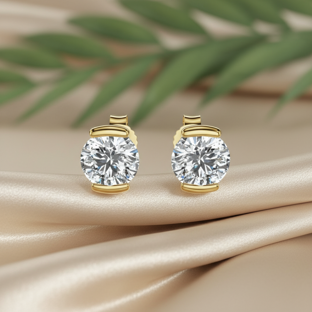 Elevate your jewelry collection with the refined beauty of these Sculpted Bar Setting Round Moissanite Stud Earrings, a perfect blend of contemporary design and timeless brilliance. At the center of each earring sits a dazzling 2.00 CT round cut colorless moissanite, known for its exceptional fire, clarity, and diamond-like sparkle.