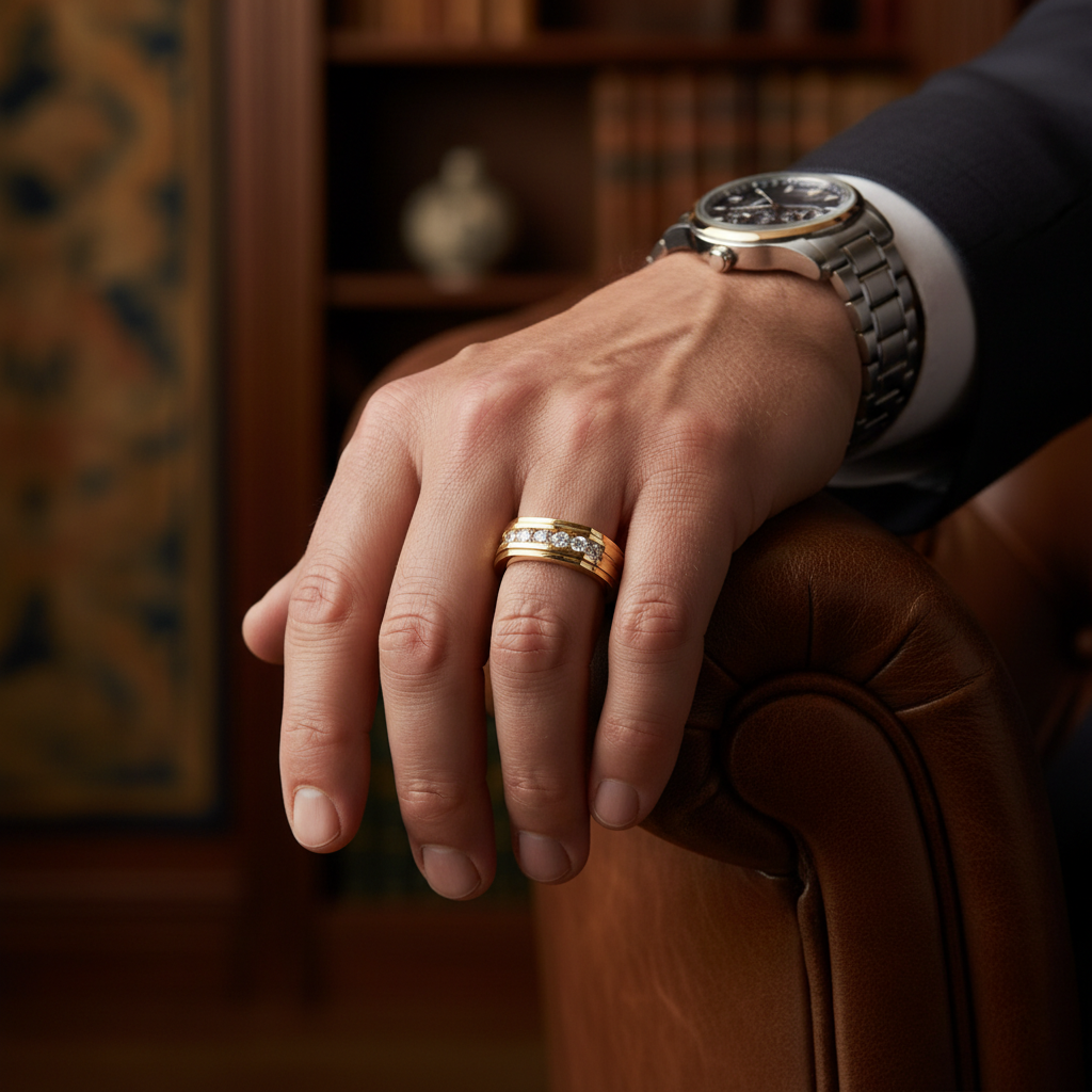 Expertly crafted in fine gold with contrasting high-polish and satin textures, the Sovereign ring reflects masterful craftsmanship and enduring style. Designed for those who appreciate bold elegance and conscious luxury, it is a timeless symbol of commitment and distinction.