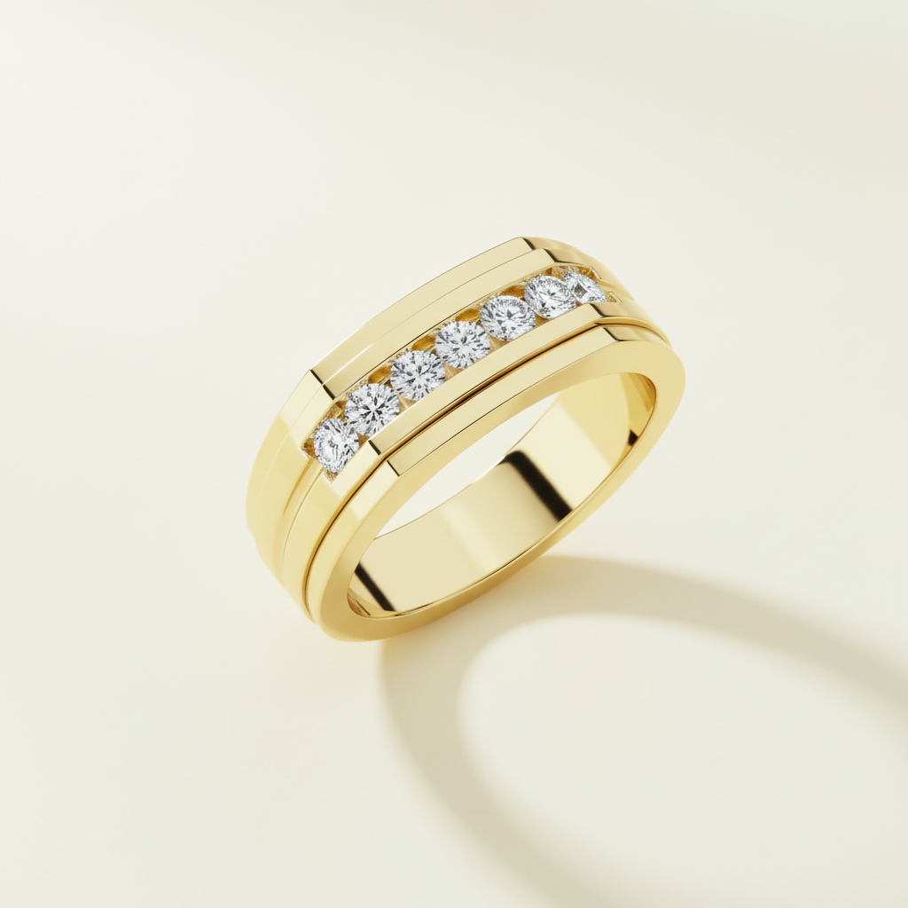 Commanding yet refined, the Sovereign Channel Moissanite Diamond Wide Gold Ring by Yana Jewels embodies strength, prestige, and timeless sophistication. This statement band showcases a sleek row of round-cut colorless moissanite stones set securely within a sculpted gold channel, framed by elegant brushed detailing that enhances depth and character.