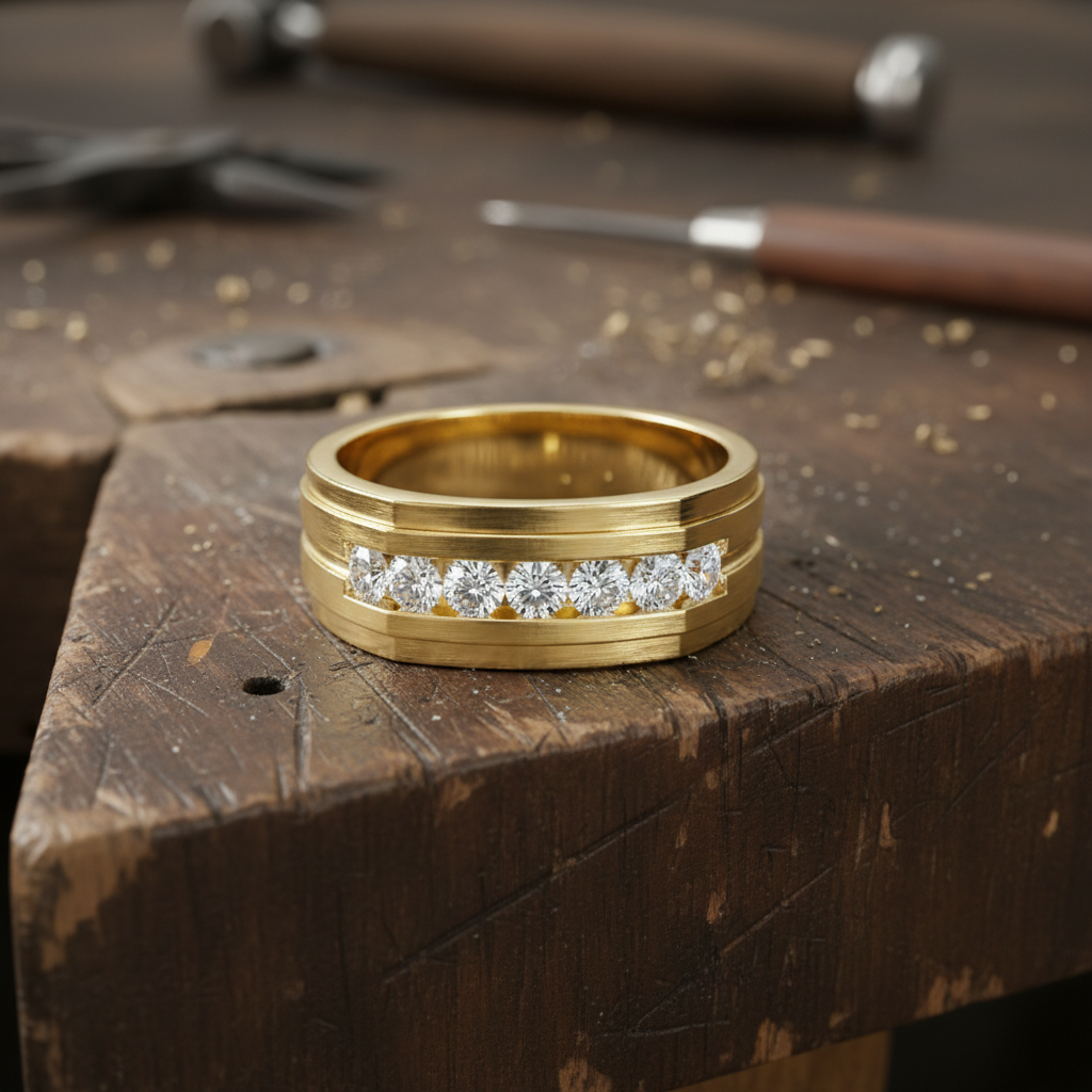 With 0.36 CT total VVS clarity moissanite, each stone delivers exceptional fire and diamond-like brilliance while offering remarkable durability and ethical sourcing. The substantial wide-band silhouette conveys confidence and modern luxury, making it an ideal wedding band, signature ring, or meaningful milestone piece.