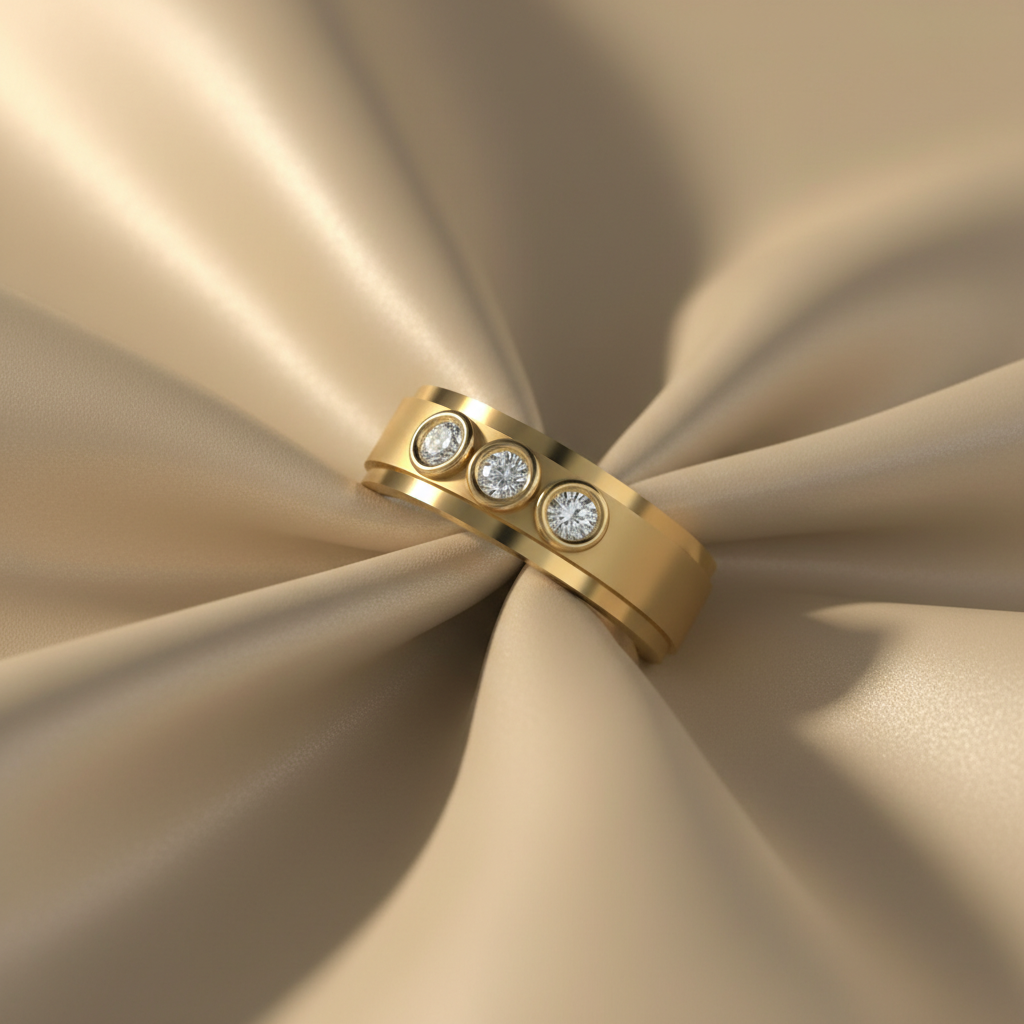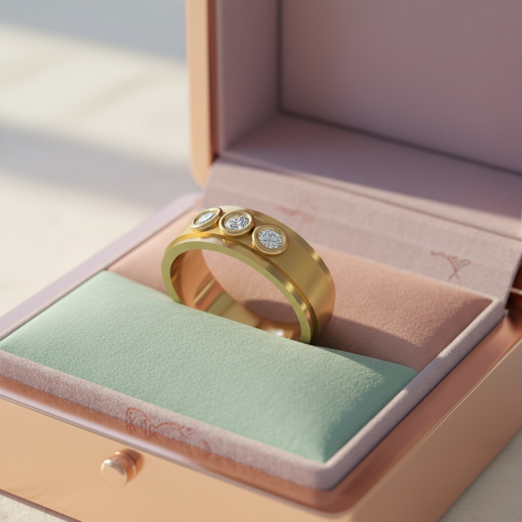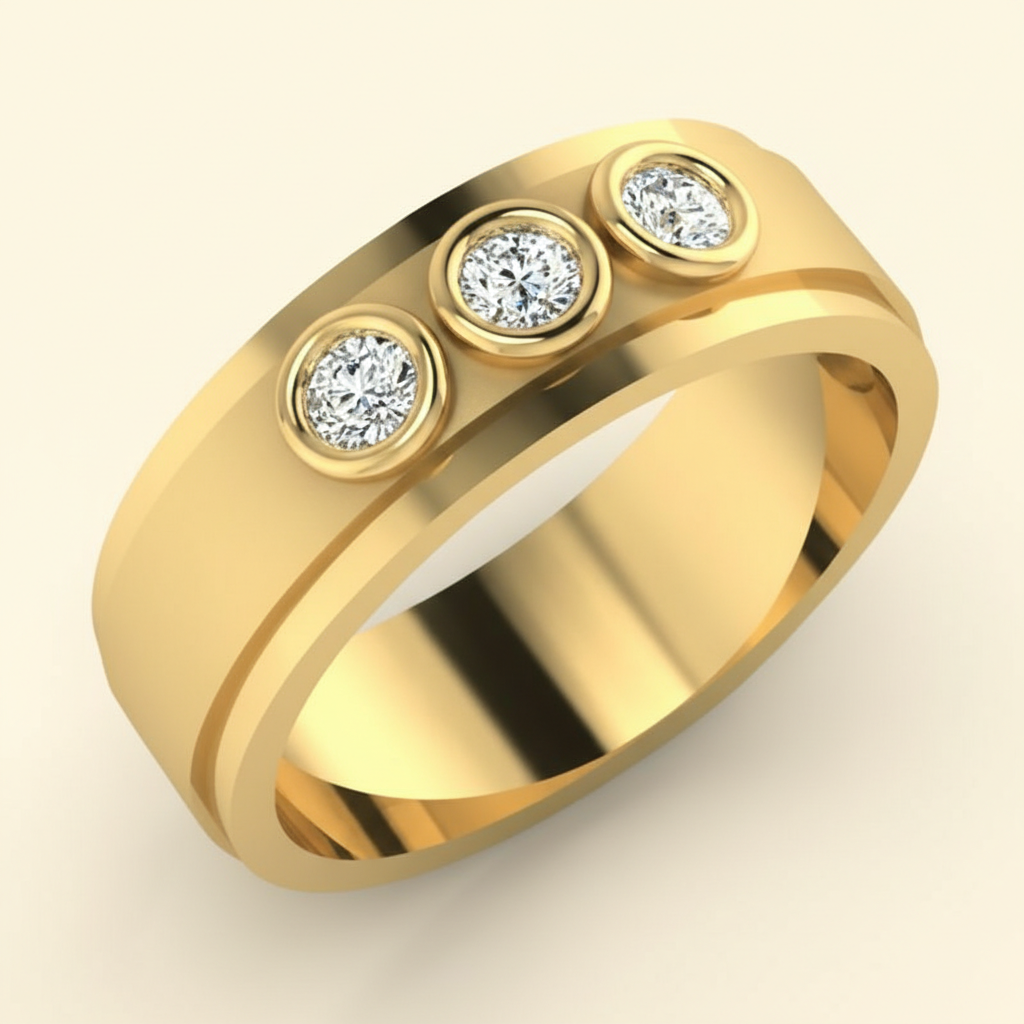 Each colorless VVS clarity moissanite is expertly bezel-set into premium gold, creating a smooth, modern profile that blends durability with refined aesthetics. The trio formation symbolizes past, present, and future making this ring a meaningful choice for anniversaries, milestones, or personal achievements.