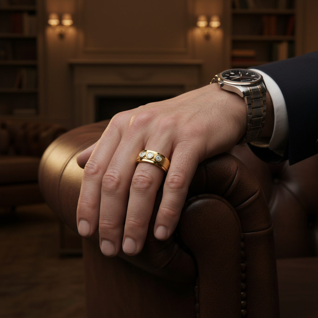 Crafted for the contemporary gentleman, the polished gold band offers a substantial feel while maintaining clean, understated luxury. The round cut stones maximize fire and sparkle, reflecting light with crisp precision without overpowering the design.