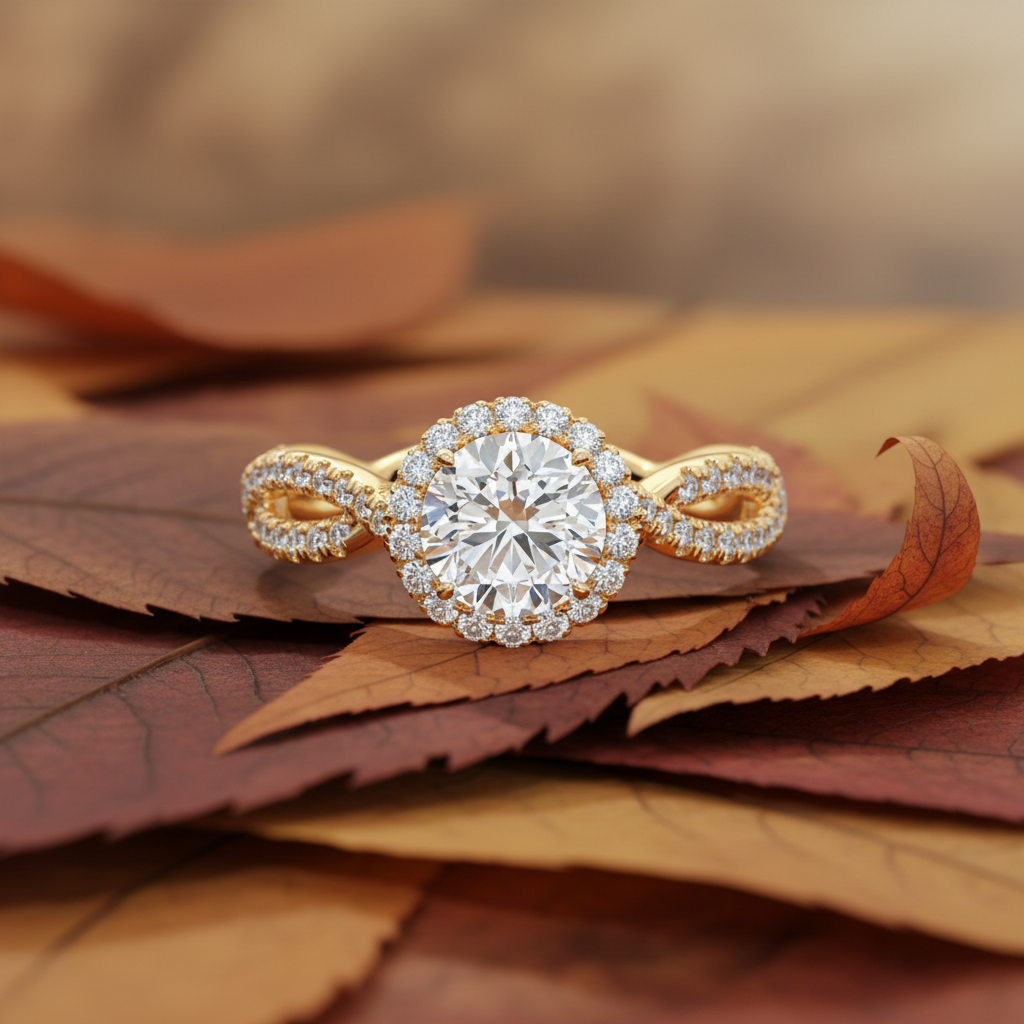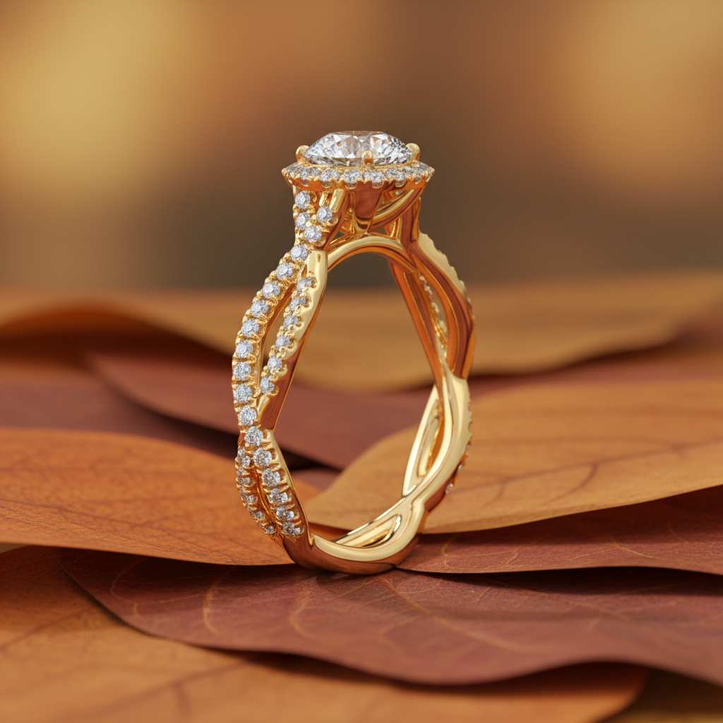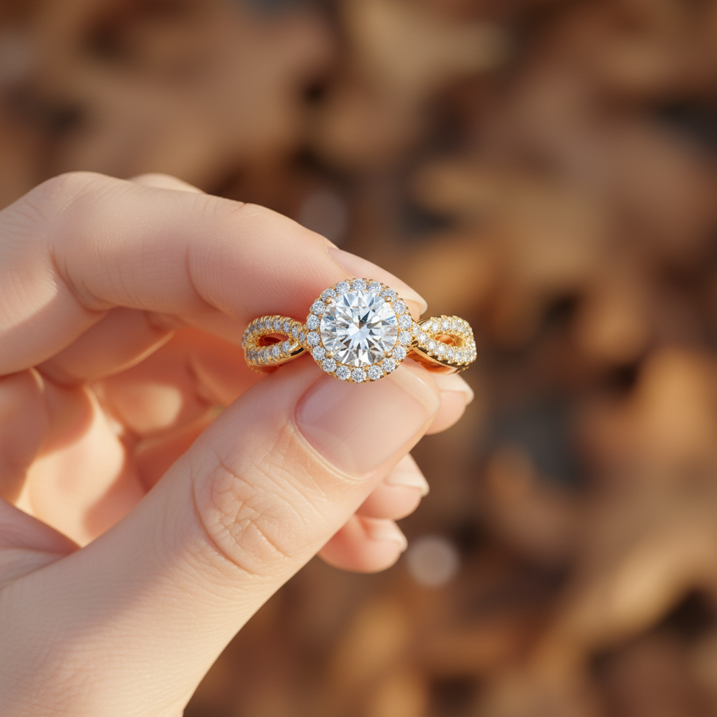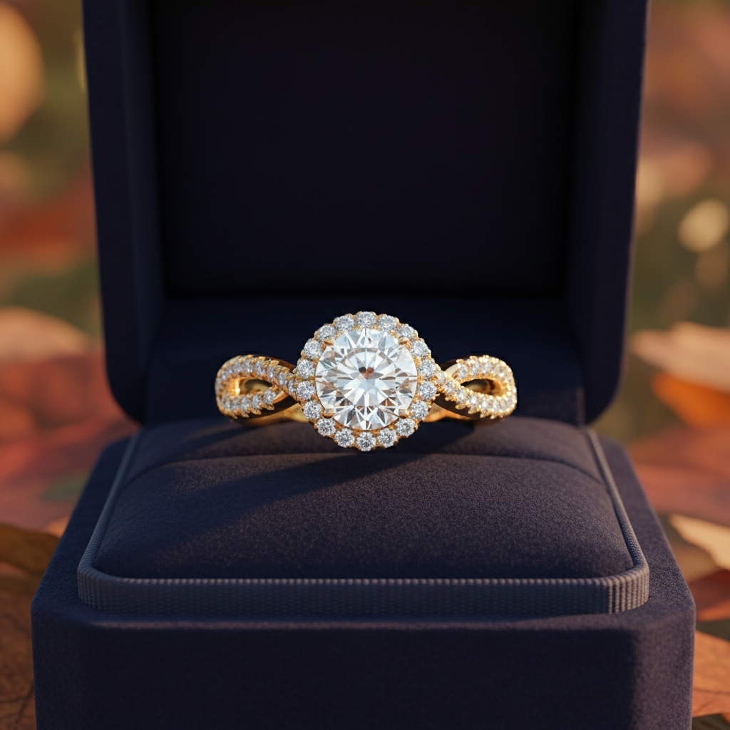Inspired by the beauty of two lives intertwined, this Twisted Band Halo Moissanite Ring is a radiant expression of modern love. At its center shines a stunning 1.50 carat colorless round-cut moissanite, expertly faceted to deliver extraordinary brilliance and fire. With VVS clarity, the center stone offers a flawless, diamond-like sparkle that captivates with every movement.