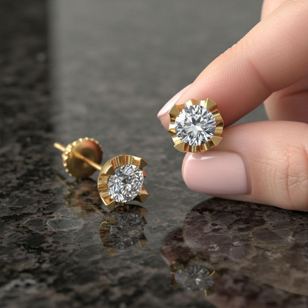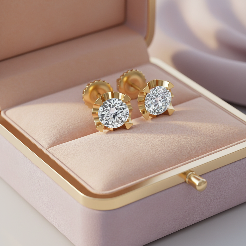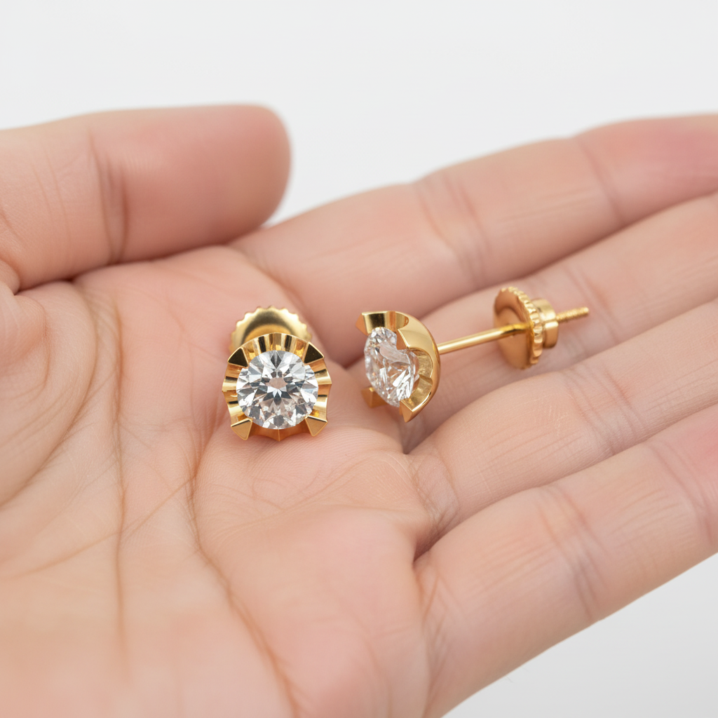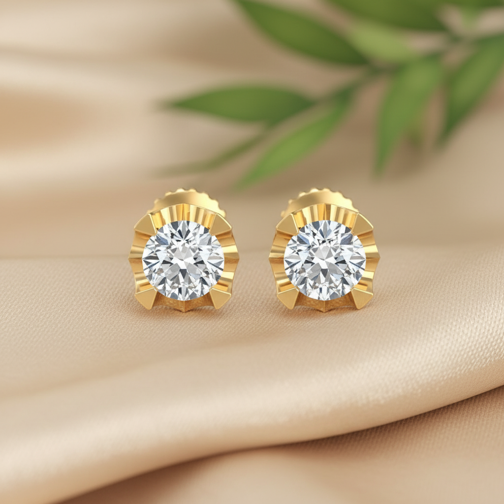 The standout feature lies in its vintage crown-inspired setting, designed with intricate fluted detailing that frames the diamond beautifully. This unique structure not only enhances the visual depth of the stone but also adds a regal touch that sets these studs apart from traditional designs.